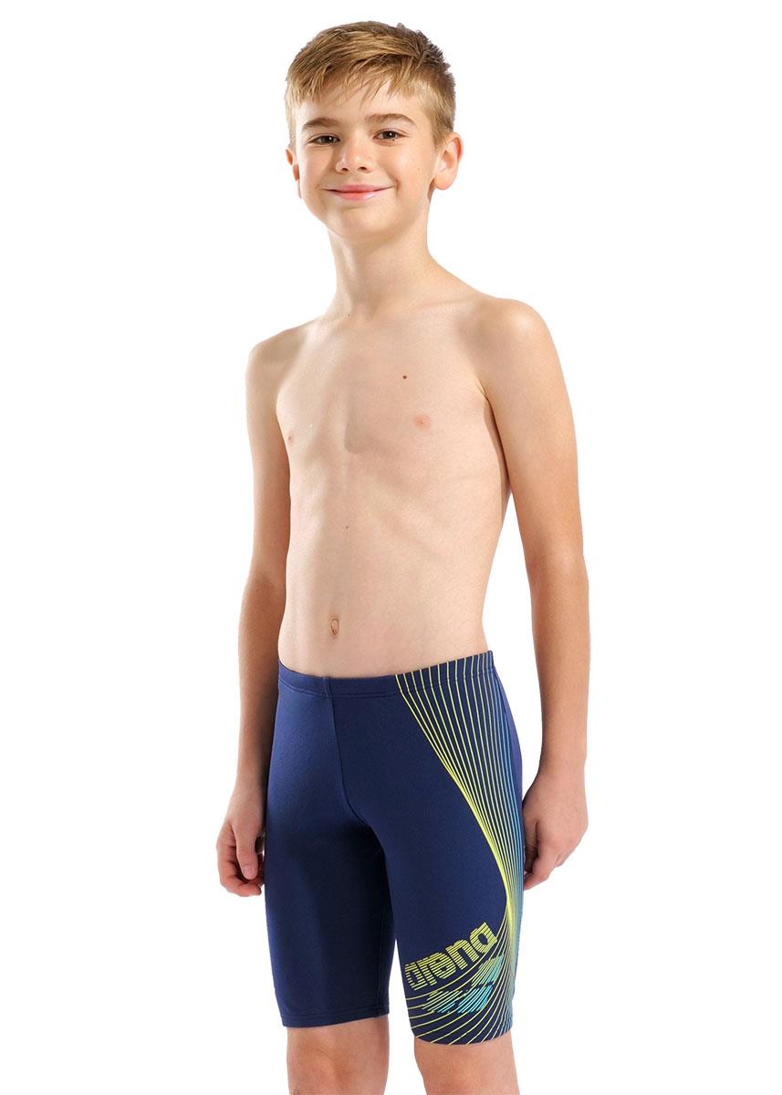 Discover the Arena Boys’ Design Swim Jammer in Navy and Yellow