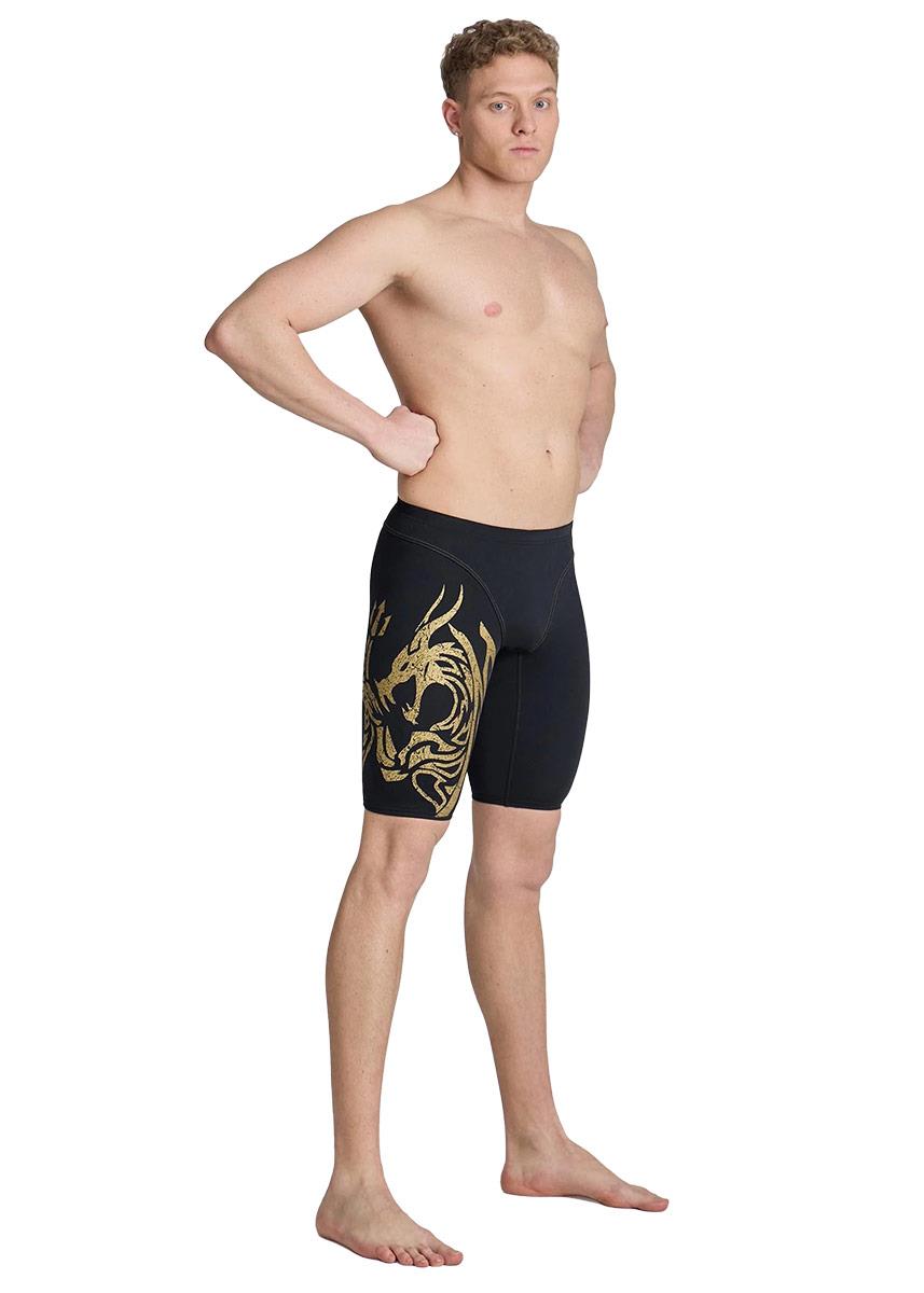 The limited edition Signature Dragon Swim Jammers are inspired by Italian swimmer Gregorio Paltrinieri, the Arena Signature Dragon Swim Jammers in black are emblazoned with a gold dragon. The dragon is a symbol of power, spirituality and courage, which is why Gregorio Paltrinieri identifies strongly with this mythical creature. This bold men’s training swimsuit measures 45 cm long and streamlines the body from the waist to the knees.