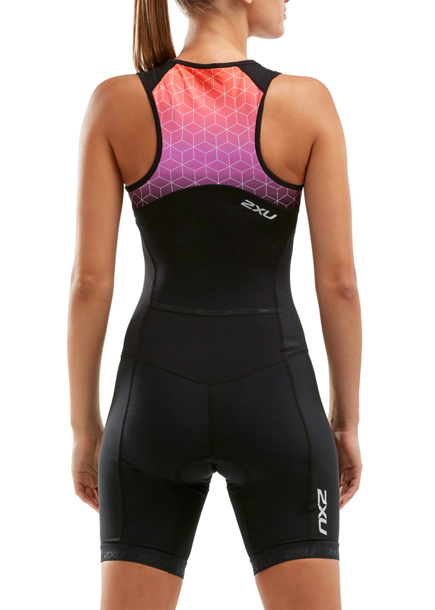 The 2XU Women’s Active Trisuit in black and Sunset Ombre features 70-denier SBR SKIN LITE fabrication on the legs for muscle support and durability, as well as SENSOR MESH X which provides optimal air flow and breathability.