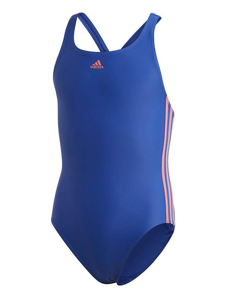 The girls Adidas Fit suit 3 Stripe swimsuit comes in a beautiful royal blue with semi flash red stripes print.