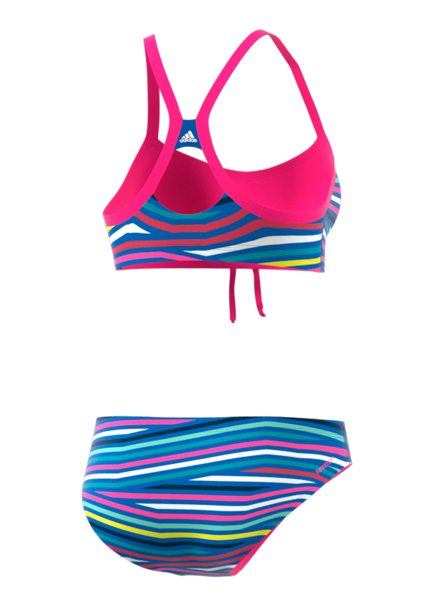 Adidas Girls INFINITEX+ Swim bikini in blue is very suitable for swimming competitions, training sessions or a day at the beach. The unique striped multicoloured pattern on this swimsuit cannot be ignored in the pool or on the beach.