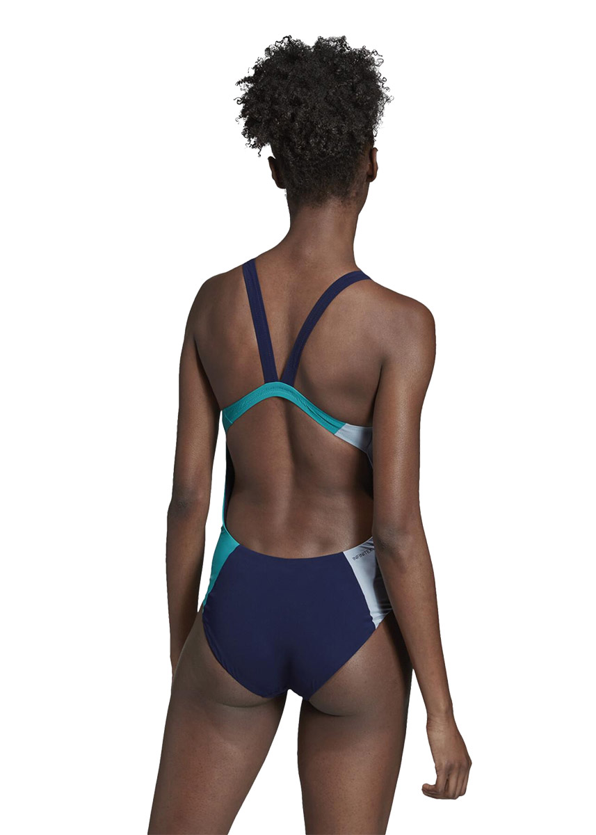 The blue and green swimsuit is built with chlorine-resistant fabric that features yarn made from recycled fishing nets and other discarded nylons.