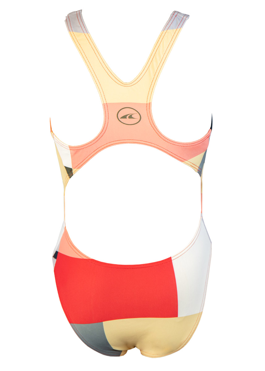 Comfortable and extremely durable, this Girl’s orange and green swimsuit is a perfect option for swim training or regular pool use. It features a new pattern which is one of Akron’s newest colourful designs.