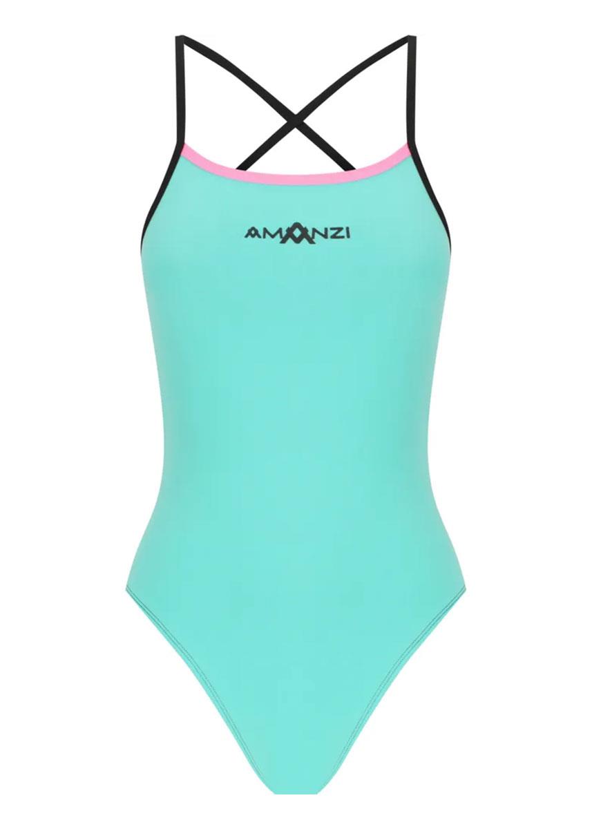 The Amanzi Cotton Candy Tie Back One Piece Swimsuit is a versatile training swimsuit that combines functionality with a fashionable edge.