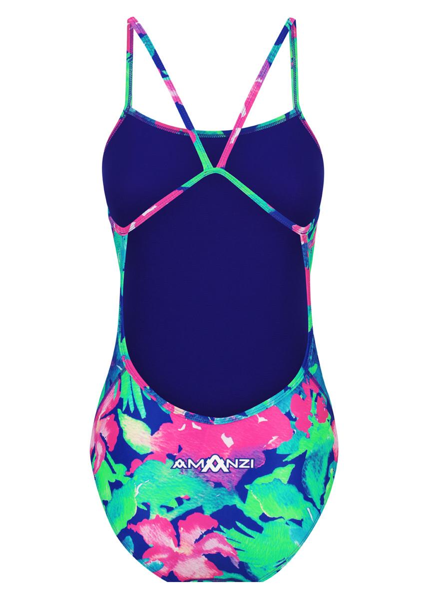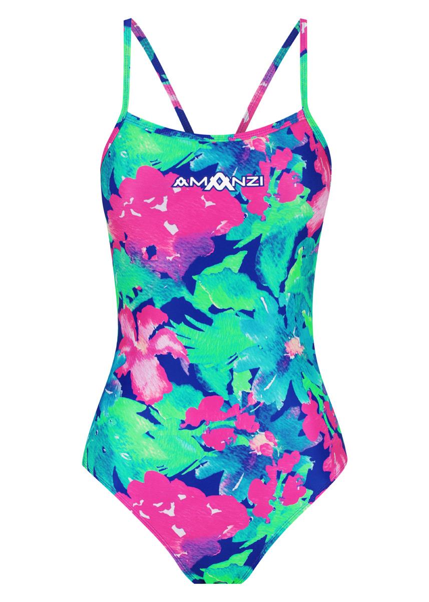The colourful floral print AMANZI Florentina Proback One Piece is a all purpose training swimsuit engineered to fit the needs of both competitive and active swimmers.