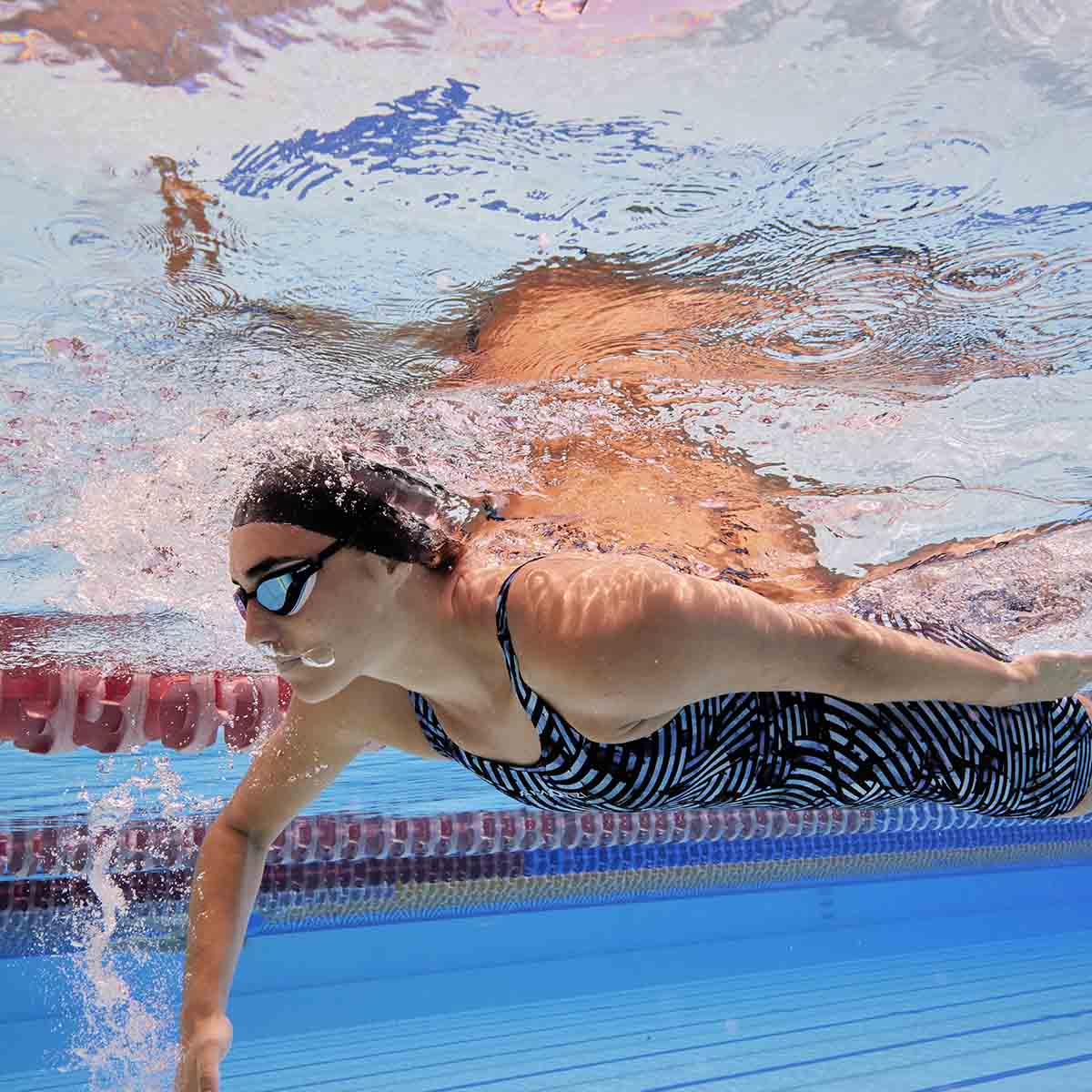 The wide shoulder straps and back band are placed between the shoulder blades, allowing for maximum freedom and ease of movement whilst swimming. They also provide added bust support. The wide-open back follows the natural contour of the body, providing an ergonomic fit and superior comfort.