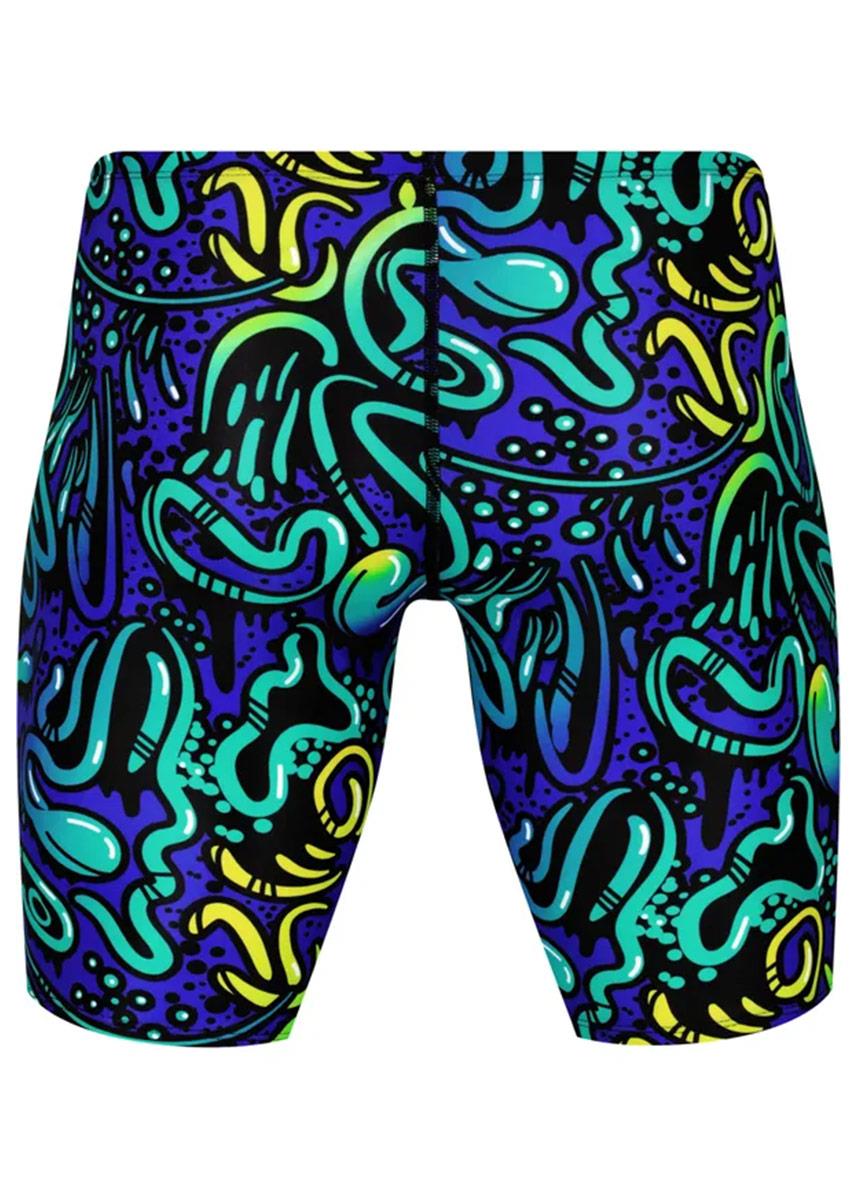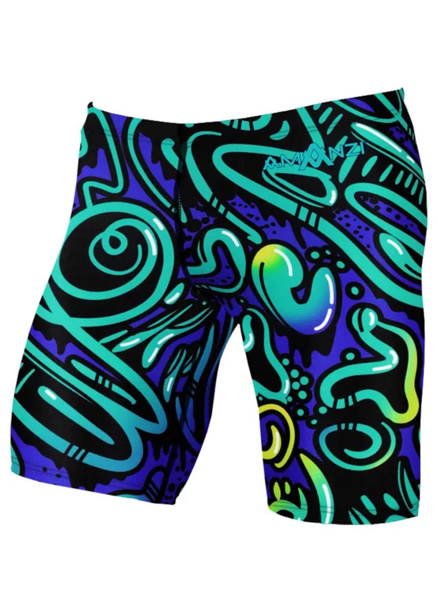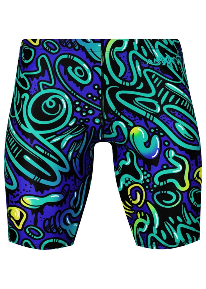 The AMANZI Enigma Jammers embody an air of mystery and intrigue. The vibrant print showcases a royal blue background adorned with graffiti-style street art. The artwork features a mix of blue, teal, and yellow hues, all expertly blended to create a stunning visual effect. Bold black outlines accentuate the artwork, giving it an eye-catching pop that is sure to draw attention. With its playful yet mysterious style, Enigma is a print that is perfect for those looking to add a touch of flair to their swim kit.