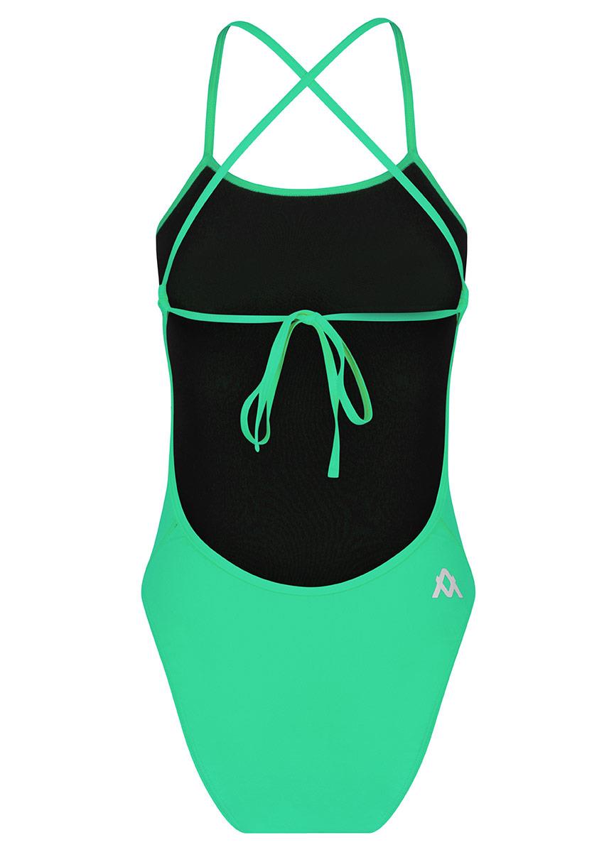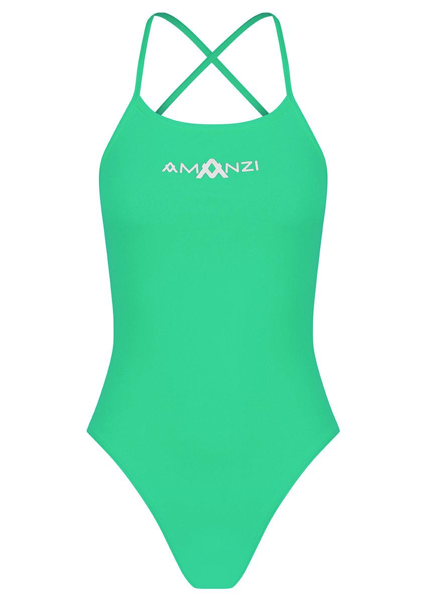 The AMANZI Peppermint Tie Back One Piece Swimsuit is an all purpose training swimsuit with a fashionable edge.