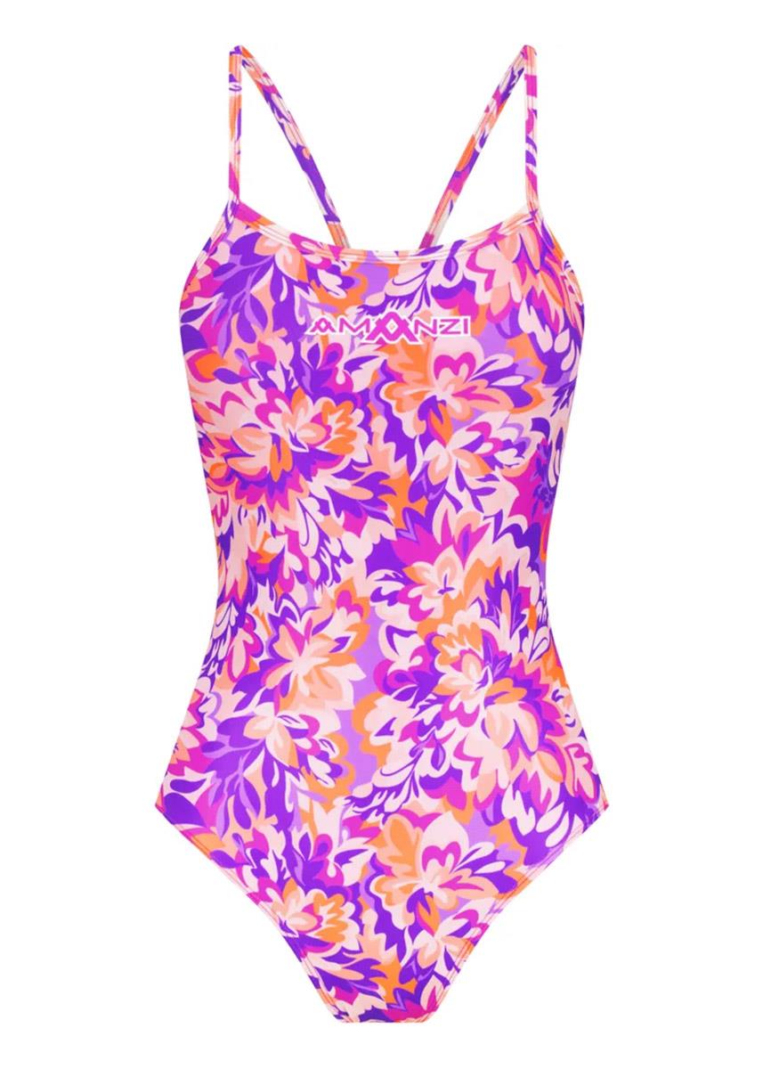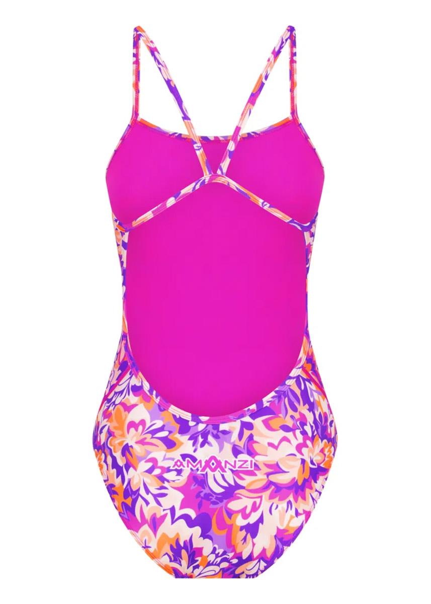The colourful floral print AMANZI Petal Pop Pro back one piece is an all-purpose training swimsuit engineered to fit the needs of both competitive and active swimmers.