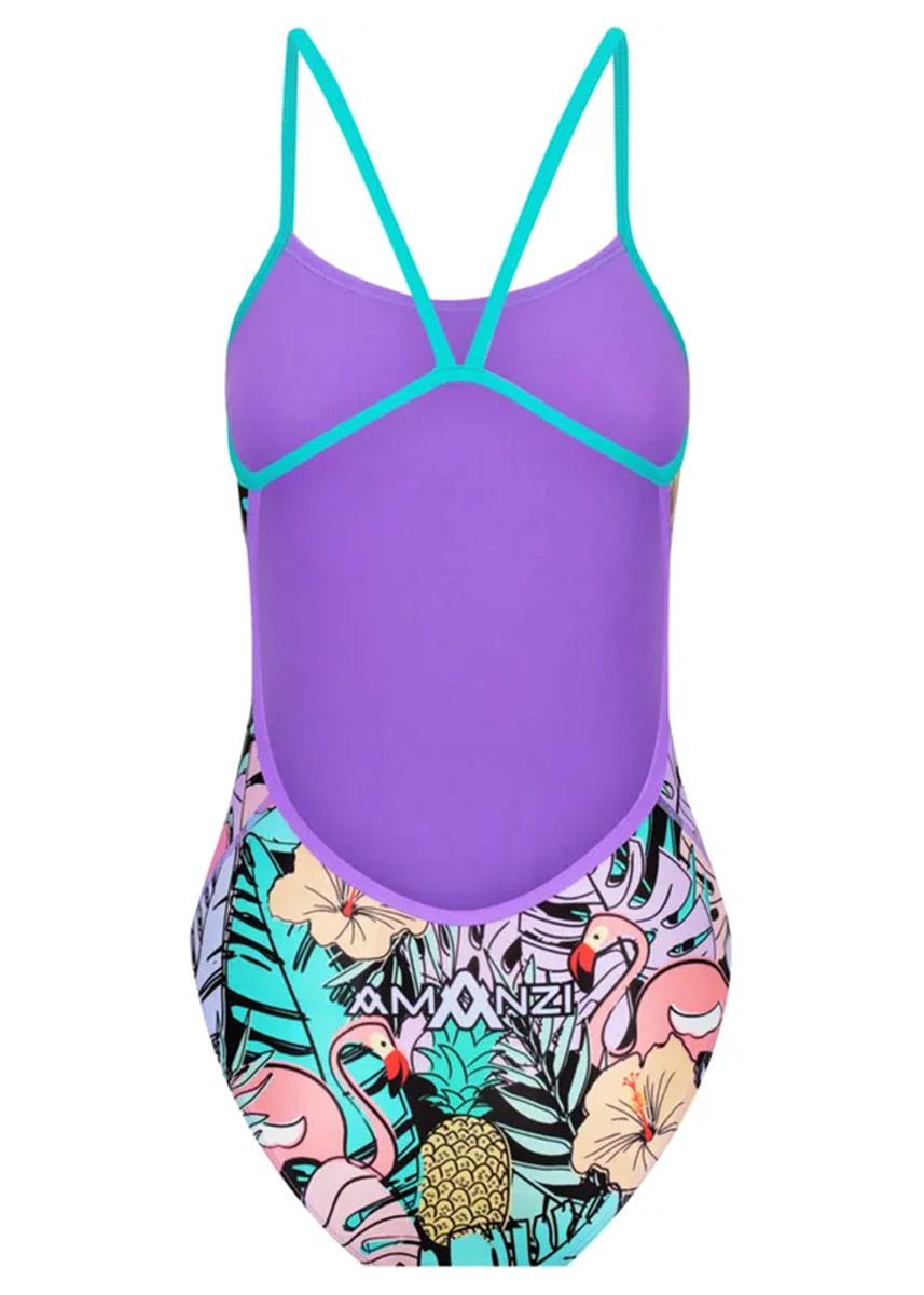 The AMANZI South Beach Proback One Piece features two rose-hued flamingos amongst the purple and teal foliage, with pink and orange hibiscus flowers adding a pop of colour to the chic black background. This unique and elegant design captures the essence of a tropical paradise Designed for the adventurous and free-spirited person who loves to stand out.