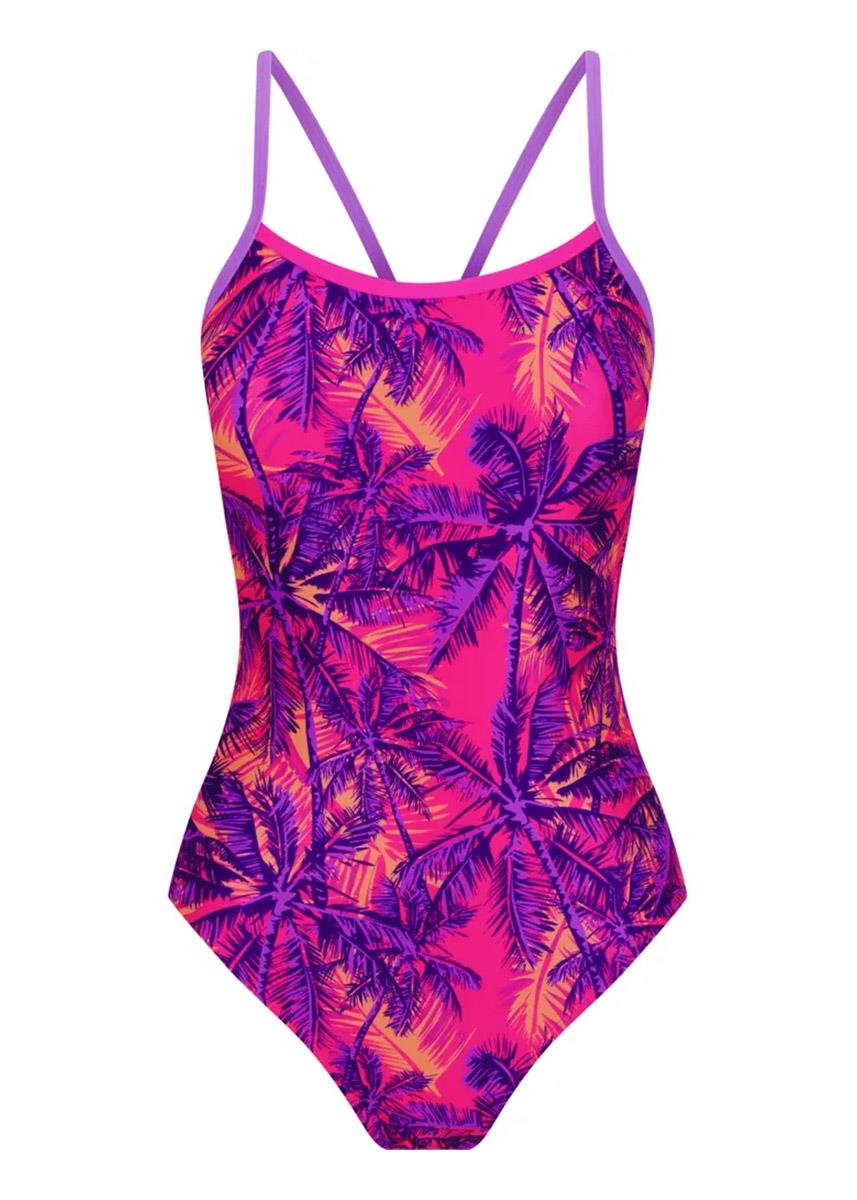 The print highlights large, stylised palm leaves, adding a lively, island-inspired feeling perfect for both training and leisure swimming.