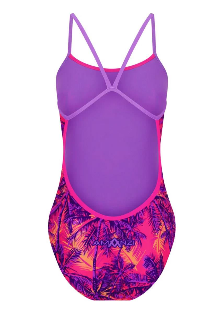 The AMANZI Tropix Proback swimsuit features a vibrant and energetic tropical pattern, with bold purple and orange hues set against a rich pink background.