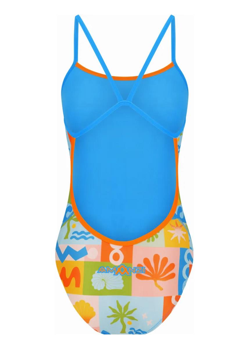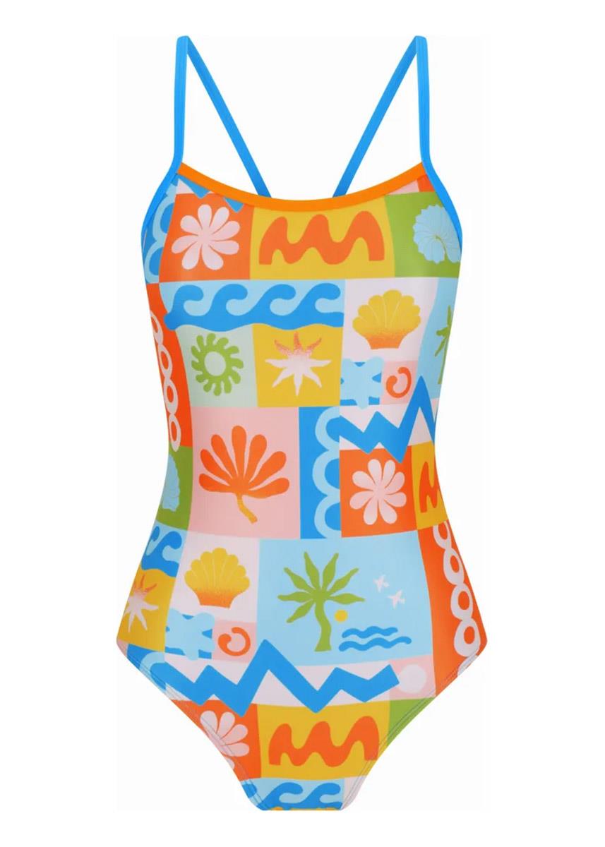 The AMANZI Vacay Proback swimsuit features a charming patchwork-style print with a vibrant mix of tropical motifs.