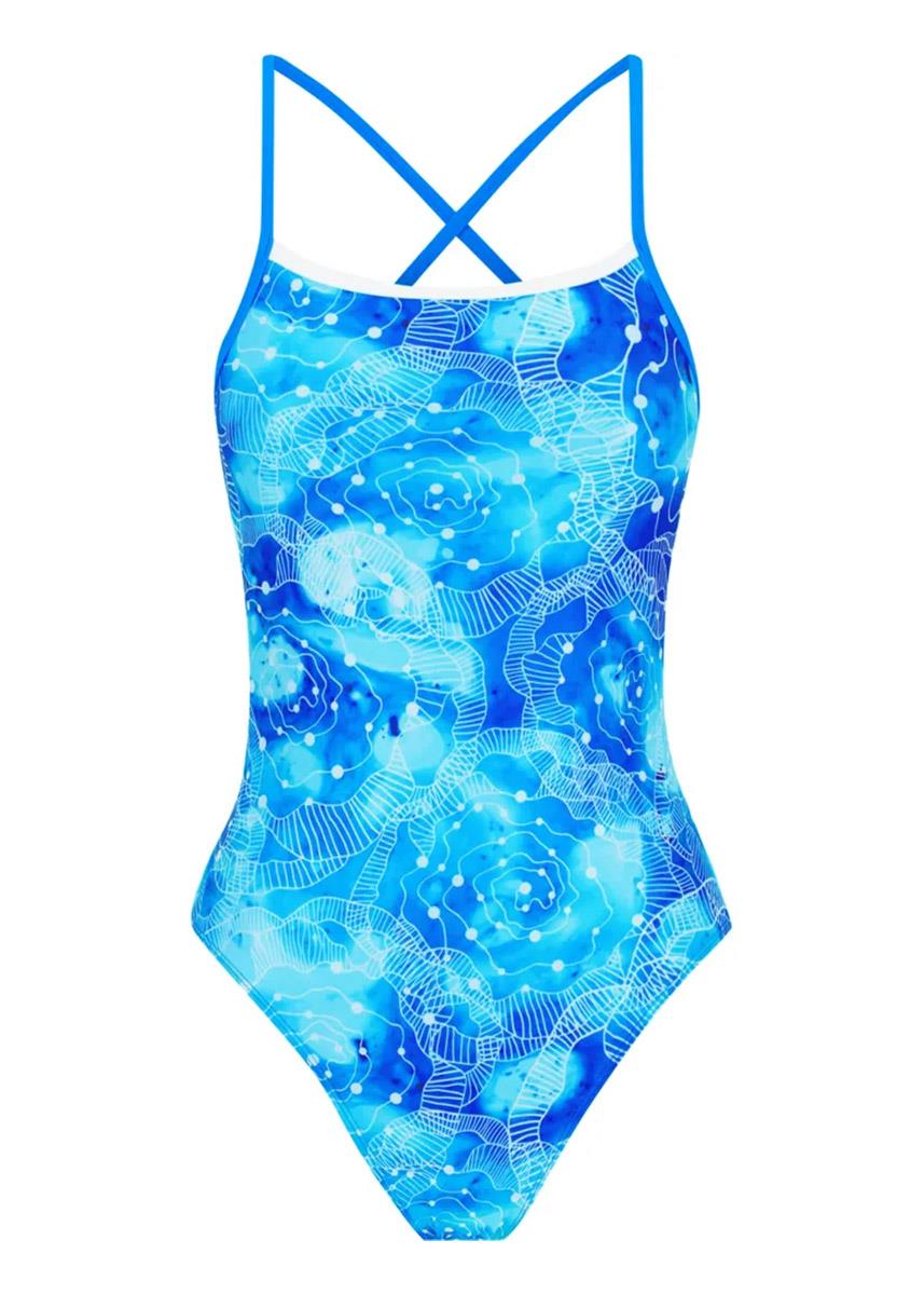Channel the beauty of the ocean in the AMANZI Roselle Tie Back One Piece with a stunning blend of vibrant blue tones and delicate white floral linework.
