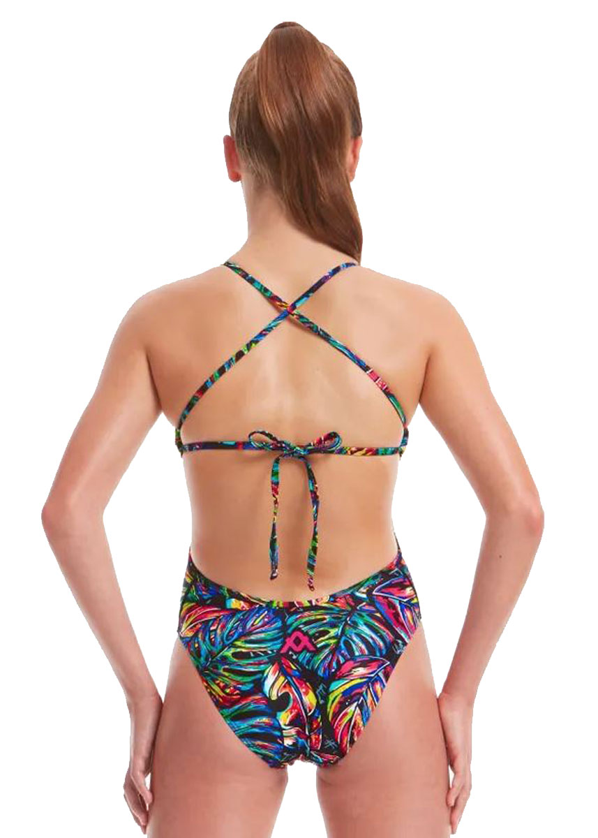The Tropical Twilight Tie Back swimsuit is an all purpose training swimsuit with a fashion edge.