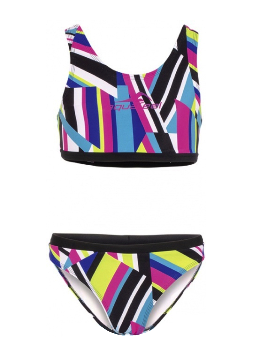 The colourful girls Stripe Confusion Racerback bikini is a great choice for young swimmers that require a new two-piece swimsuit for open water or regular pool use.