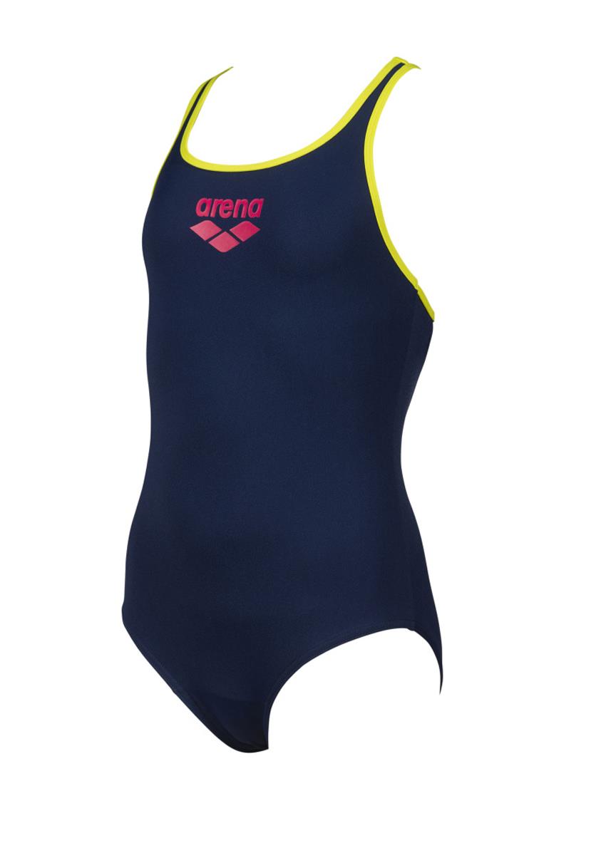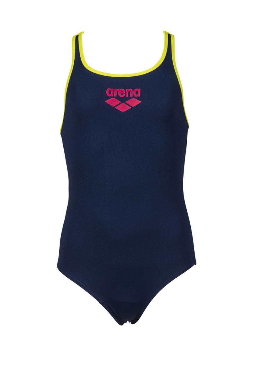 The navy blue and green girls Arena Big Logo Pro back swimsuit is a great choice for young swimmers that require a durable swimsuit.