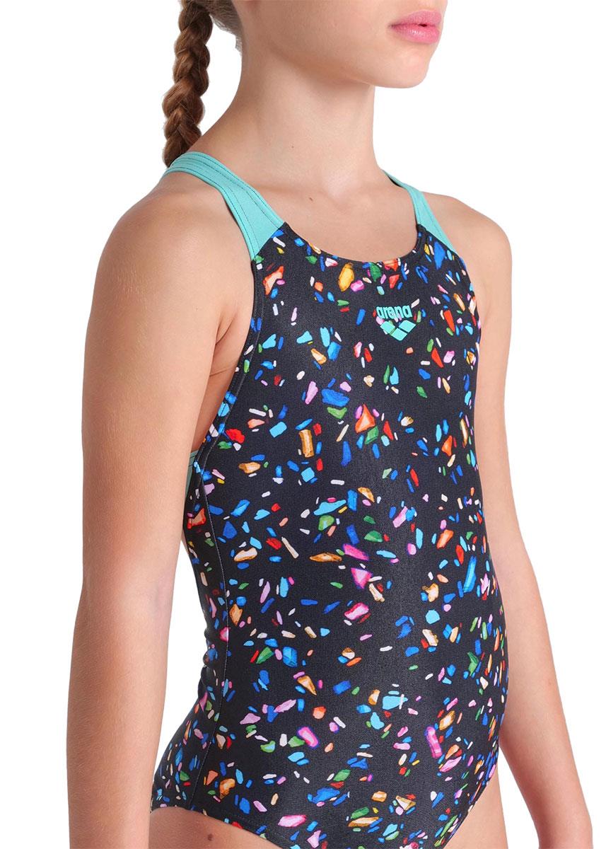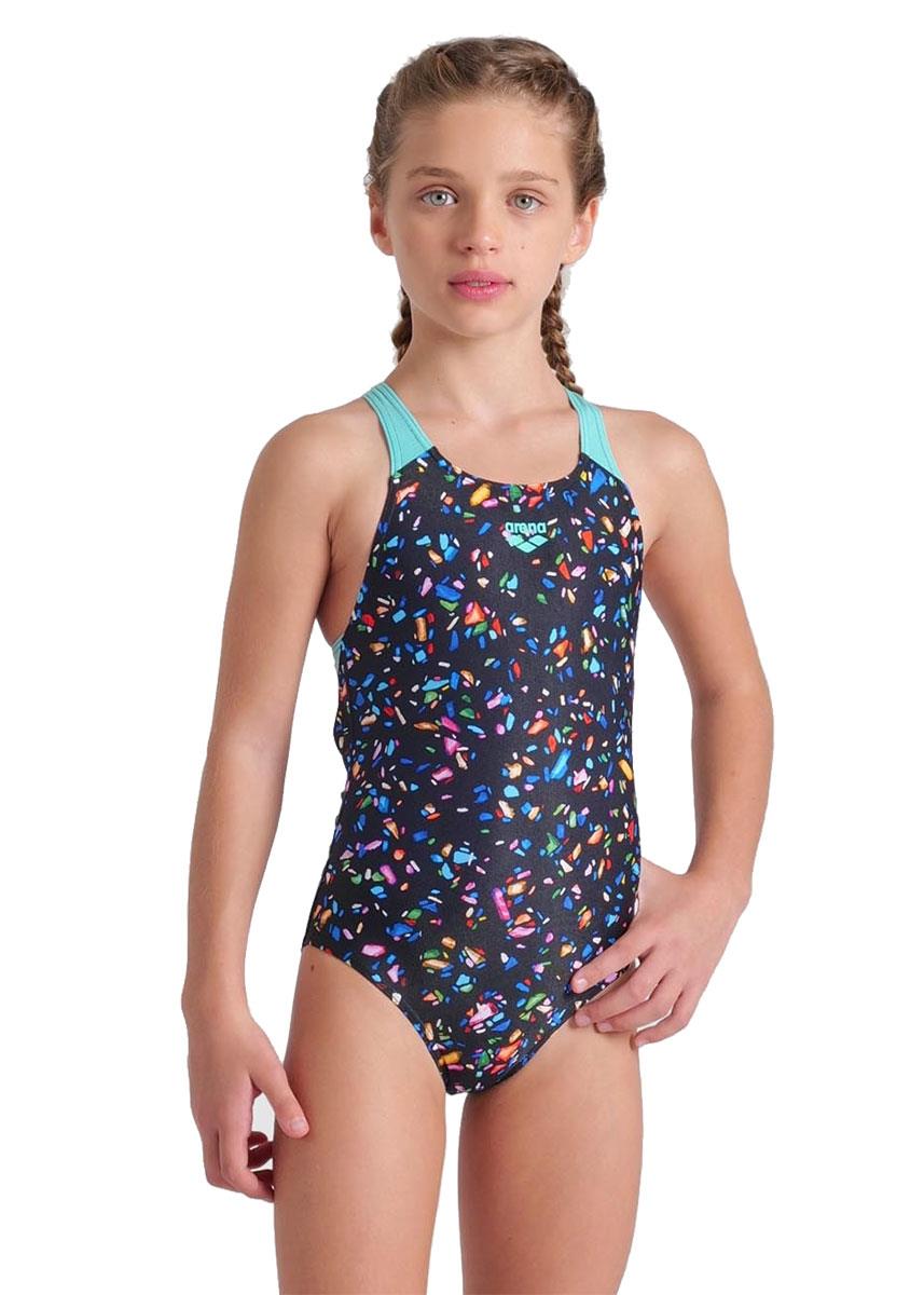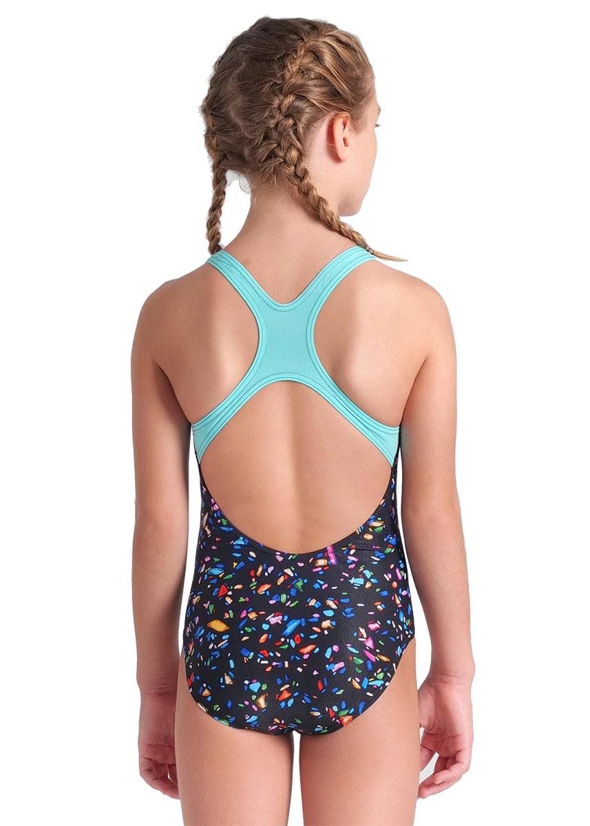 With a kaleidoscopic print and dual-coloured straps, the Arena Girls Confetti Swim Tech Back Swimsuit will add a festive touch to your long hours at the pool.