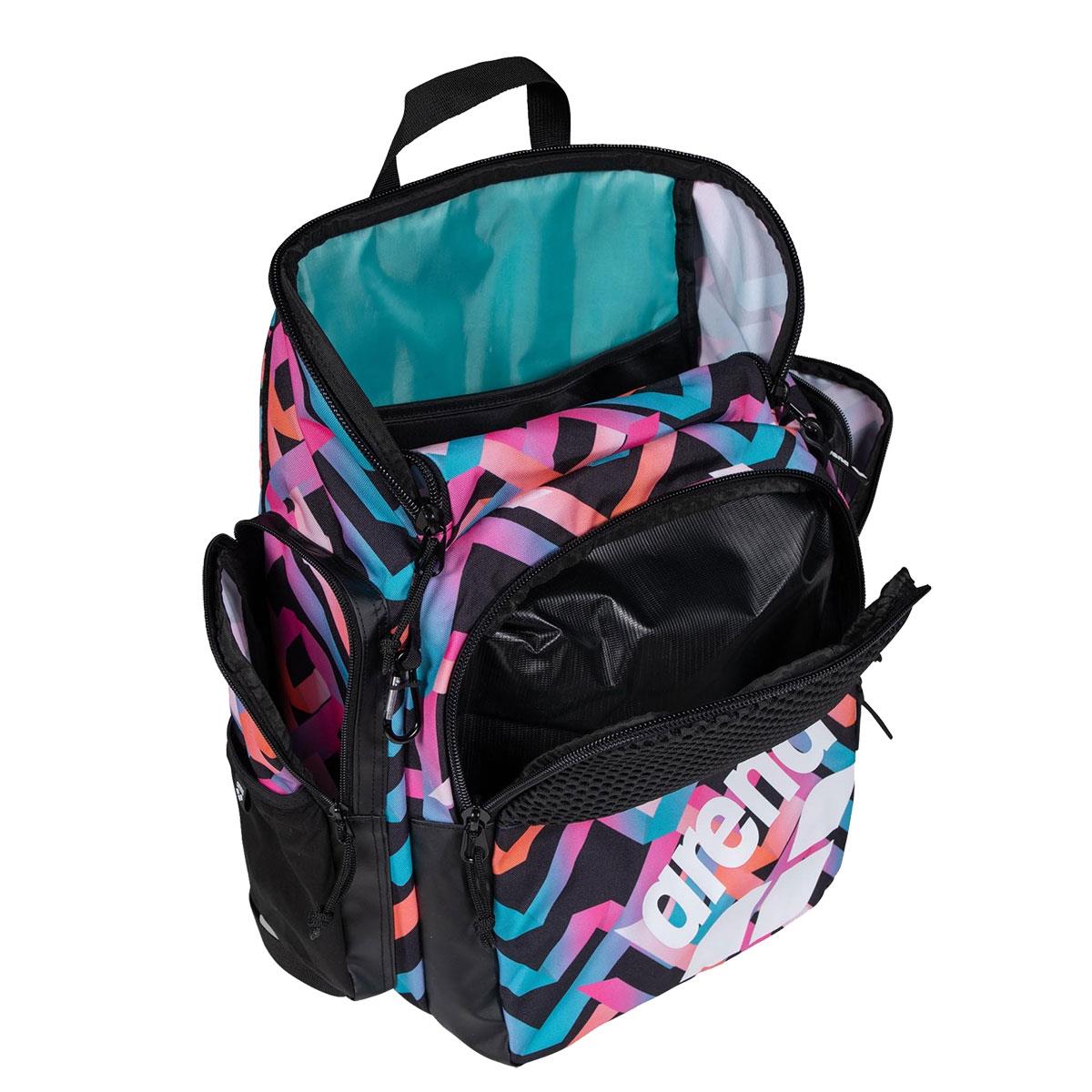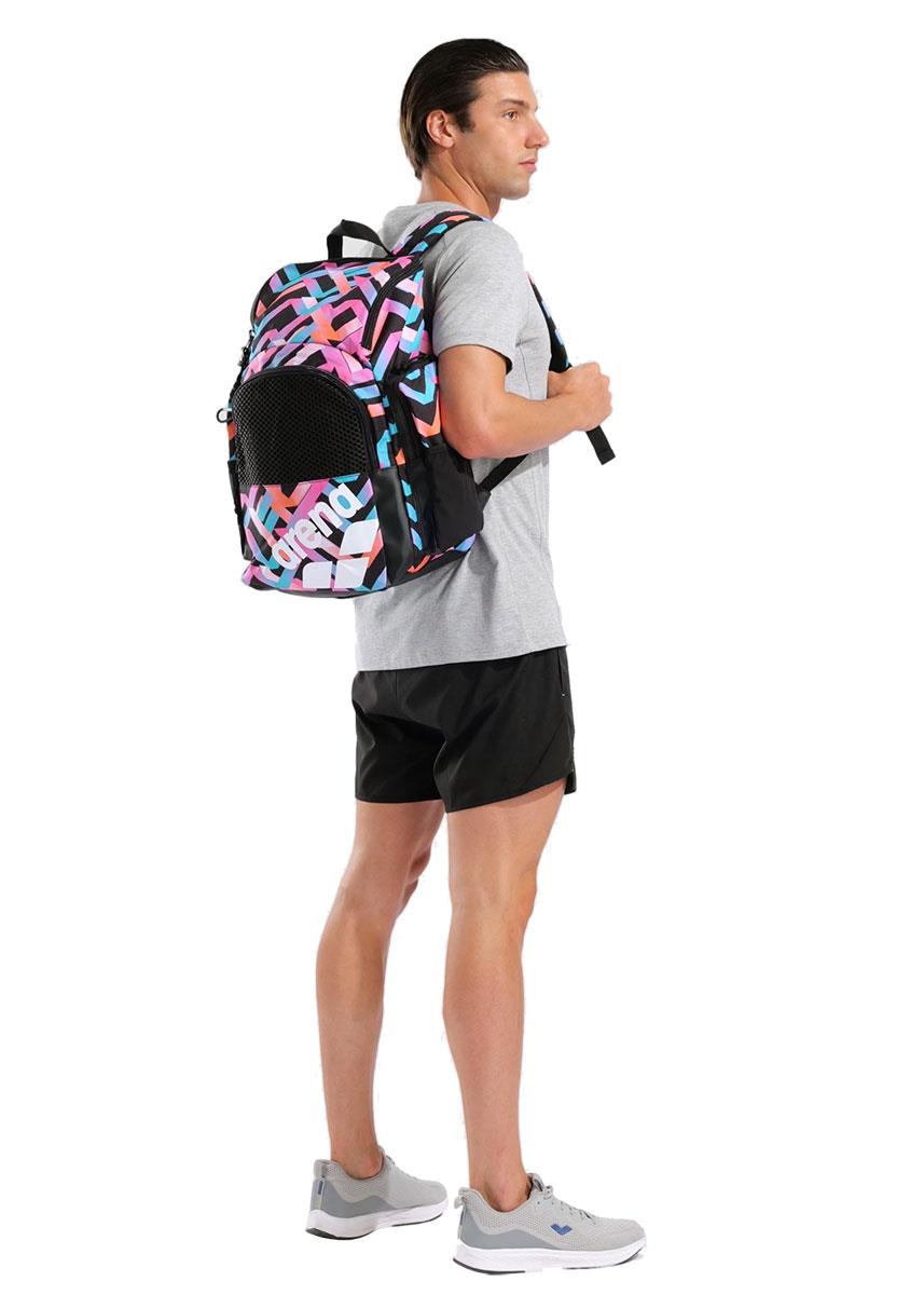 The Arena One Go Backpack 35L All Over – Texture combines modern style, comfort, and practical features, making it the ideal choice for swimmers on the move.