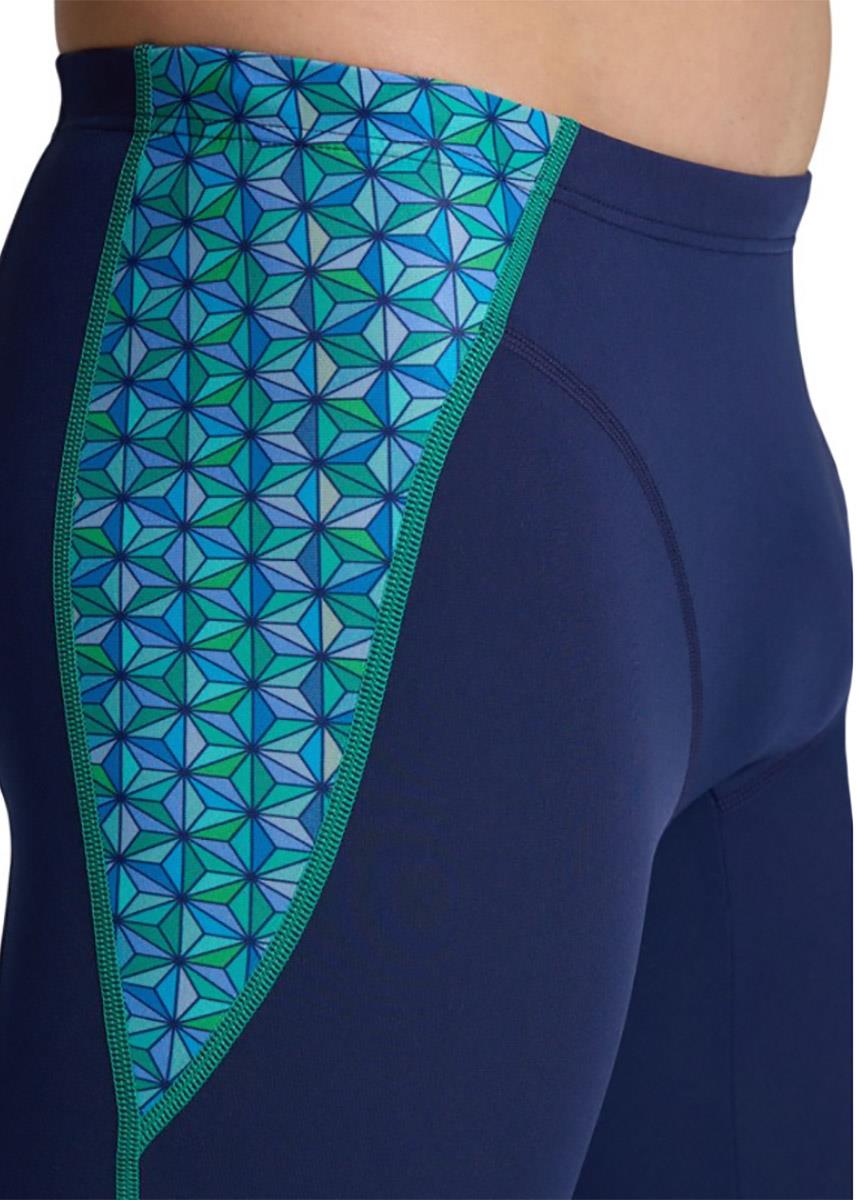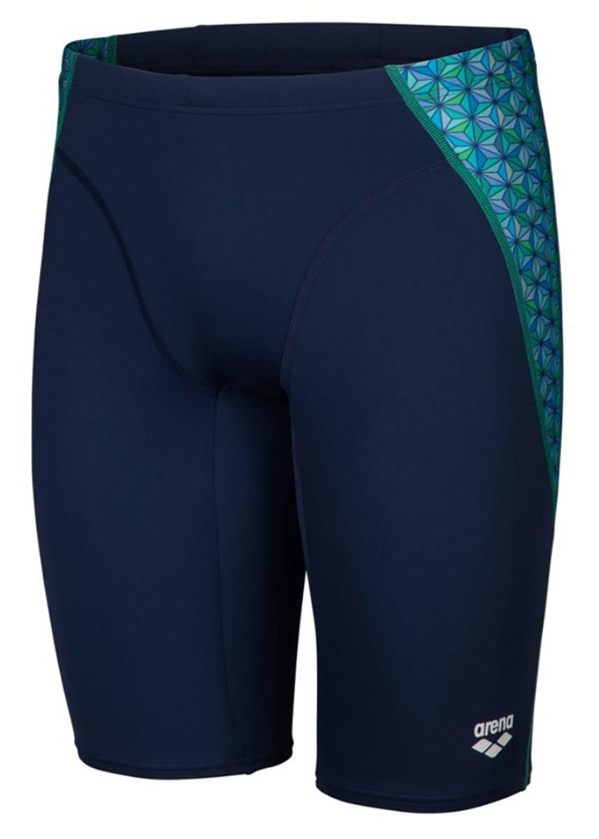 These arena Jammers feature a geometric print side panel that stands out against the Navy blue base fabric.