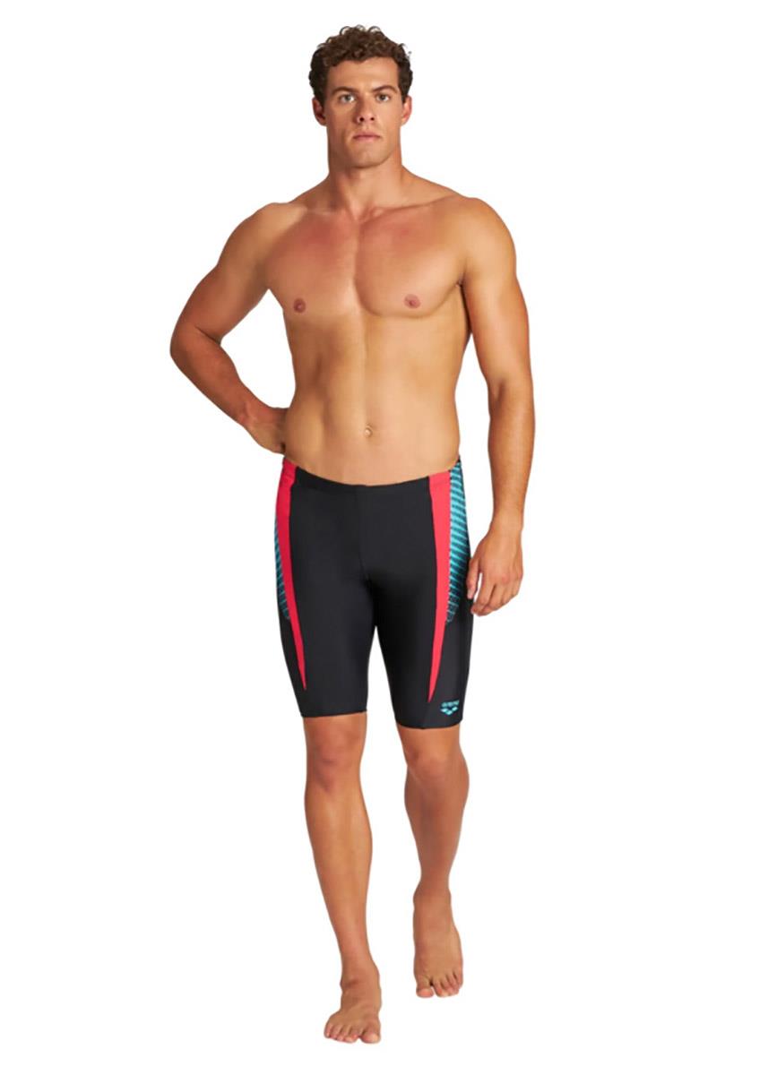 The Black, Red, and Blue Arena Threefold jammers feature a stylish eye-catching print that will boost your confidence at the pool.