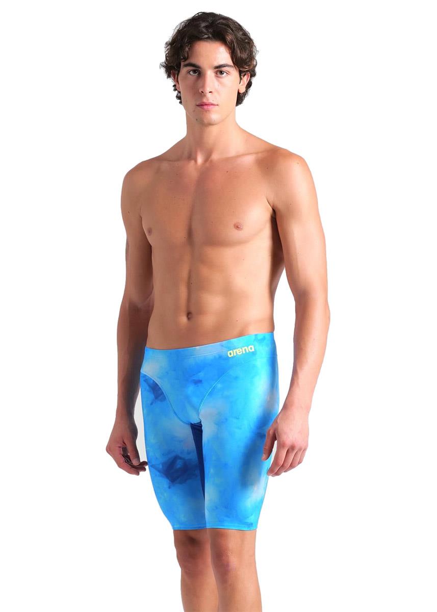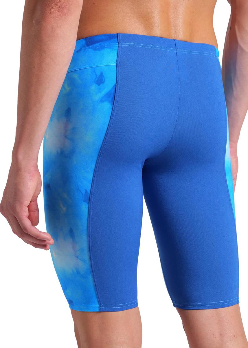 The Arena Tie-Dye blue jammer features a stylish design in shades of blue on the front and down each thigh.