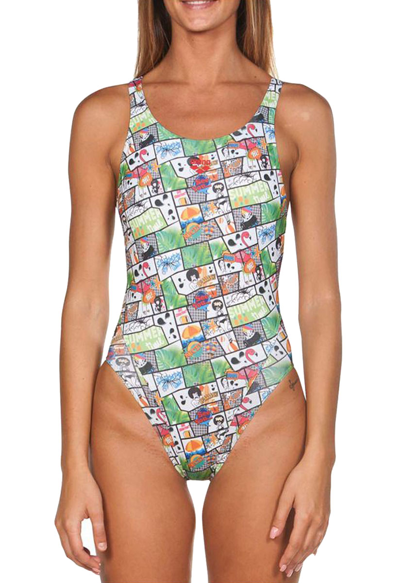 The new Women’s Arena Summer Comic Swimsuit is the ideal swimsuit for those intense training days. The Green comic style patterned suit has a swim tech back, having the wide opening combined with the thick straps, this suit gives you the maximum freedom of shoulder movement and reduced drag for improved glide.
