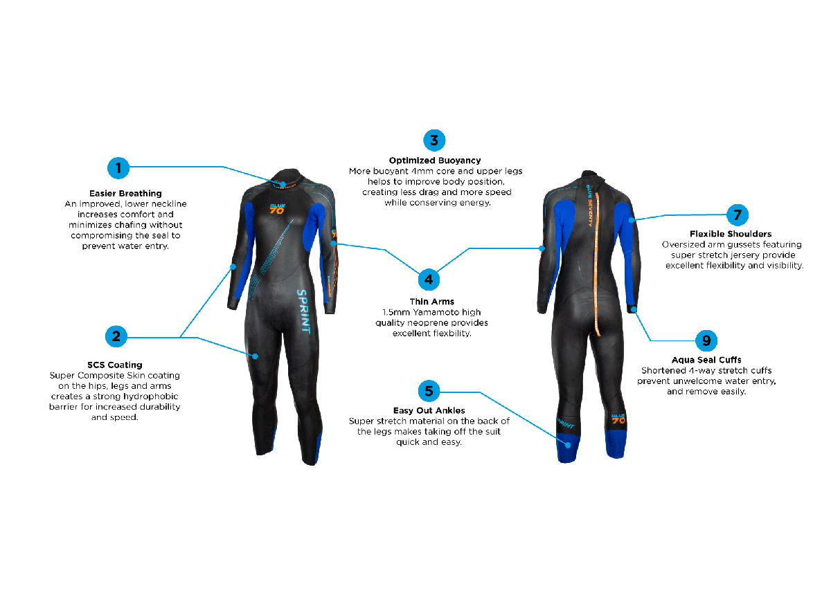 Blue Seventy’s Women’s new Sprint Wetsuit is built with thinner neoprene and strategically placed super-stretch nylon to greatly improve flexibility at the arms and legs. No other suit at this price delivers true open water swimming comfort without sacrifices to quality.