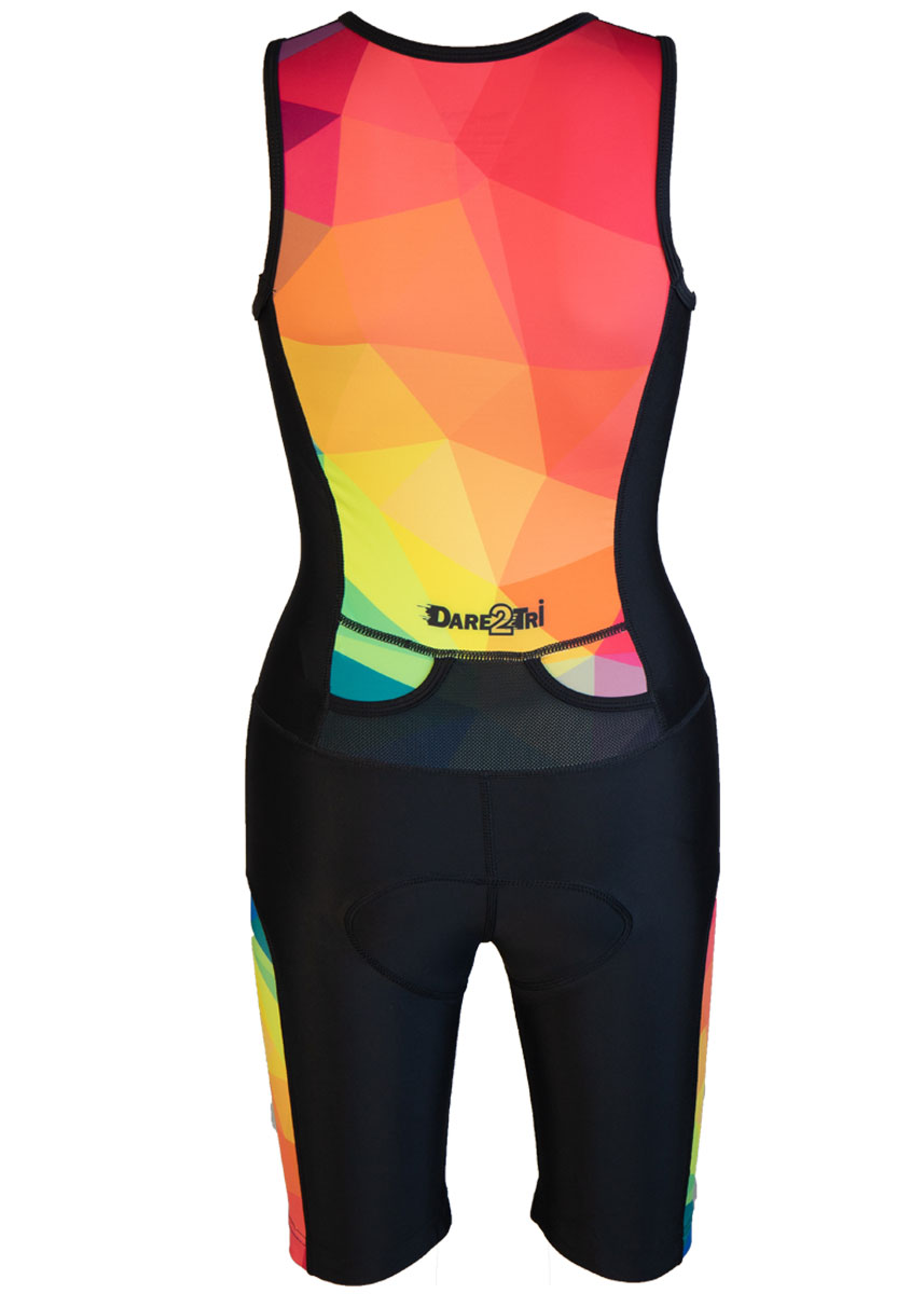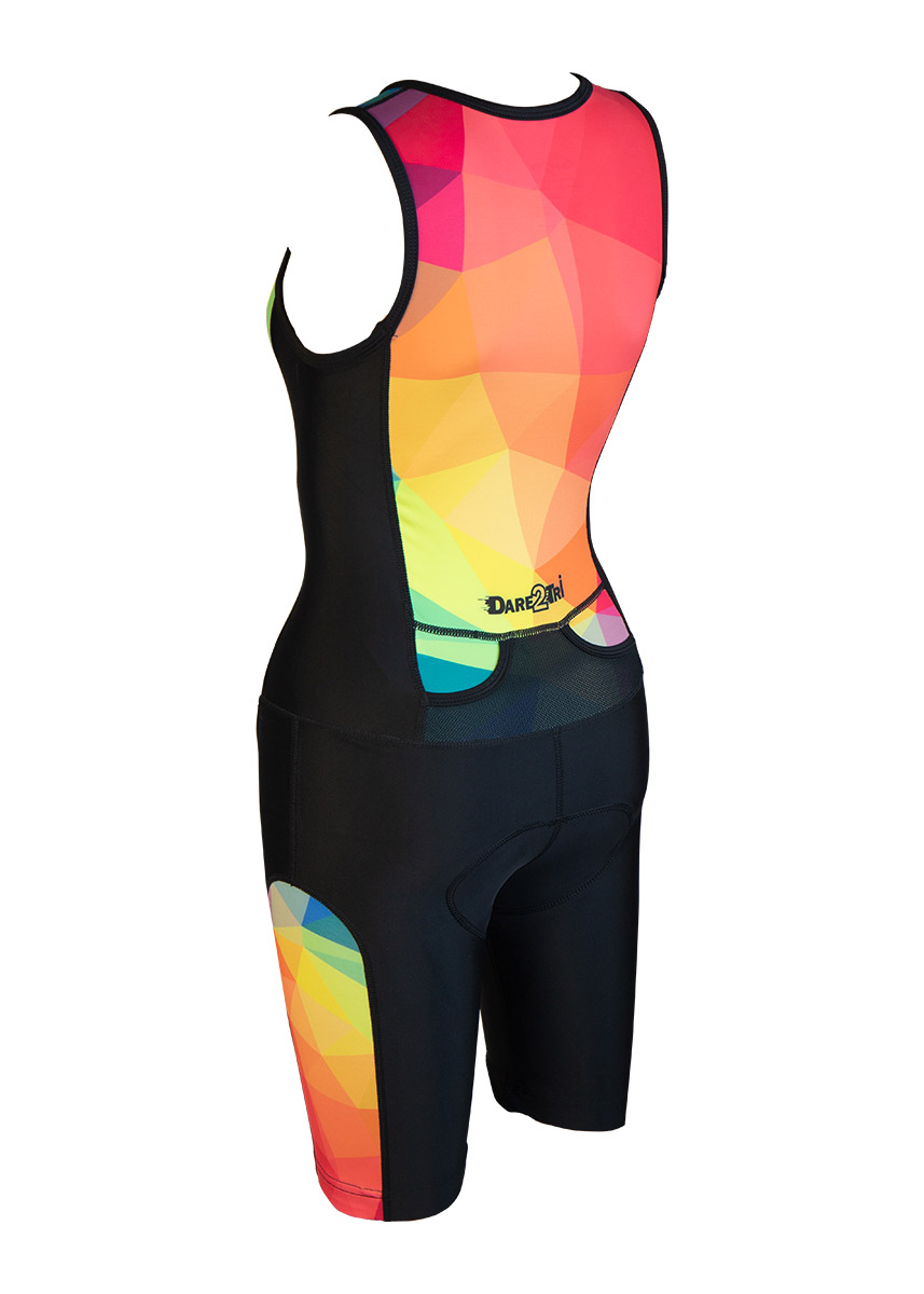 The new Women’s LTD Funky Dare2tri Tri-suit in a black and red pattern is engineered to be the best fitting and comfortable triathlon suit on the market. This multi-use tri-suit is perfect for triathlons as well as other sports and utilises the latest innovations to ensure a perfect fit without being restrictive.