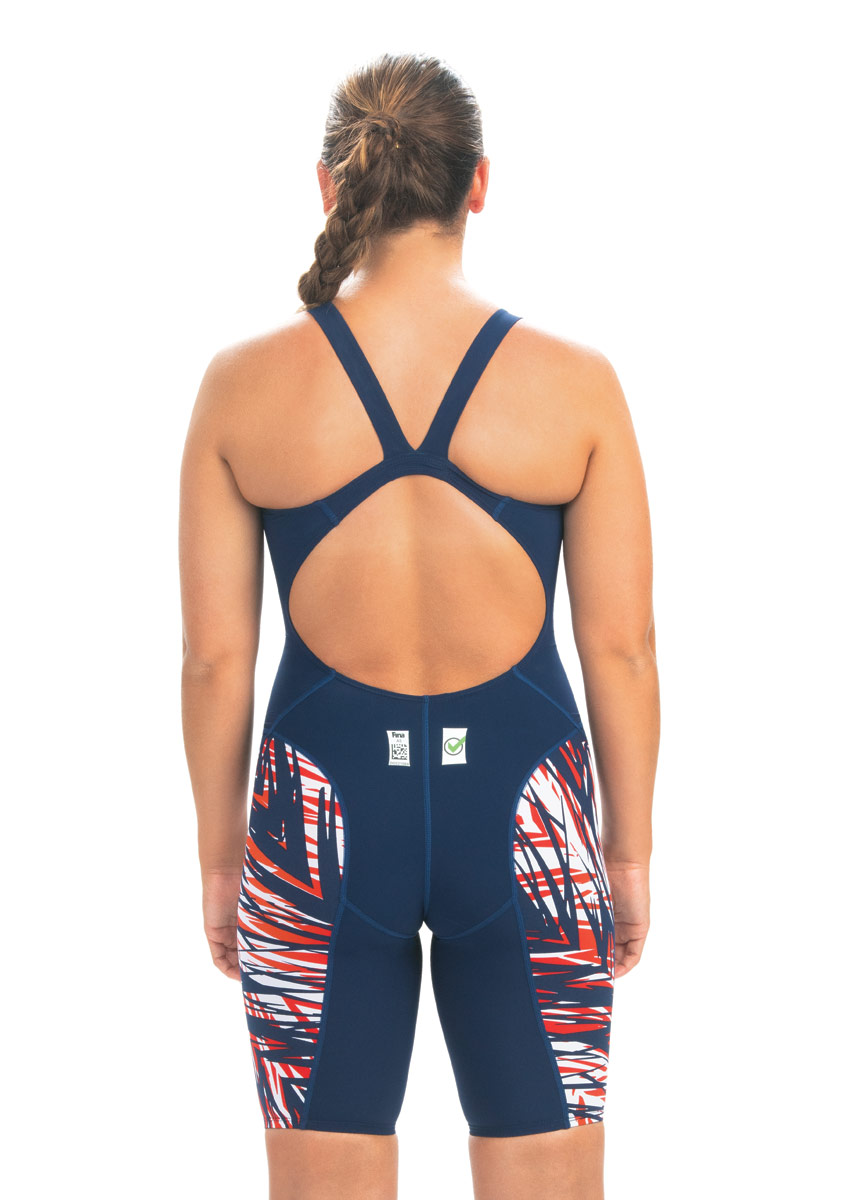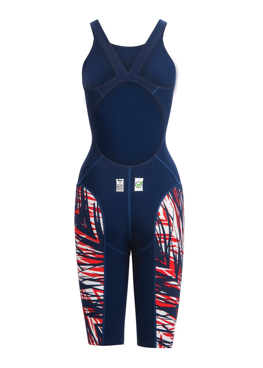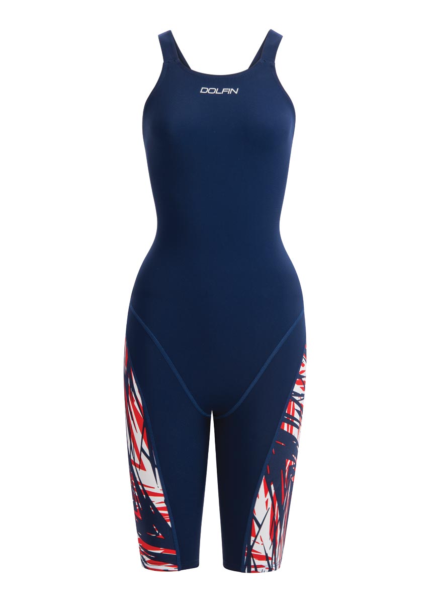This new navy blue FINA Approved Dolfin Firststrike Kneesuit has a red, white and blue pattern detail on the leg. This Dolfin Kneesuit has been designed for racing, it is a great choice for those that want to start performing regularly.