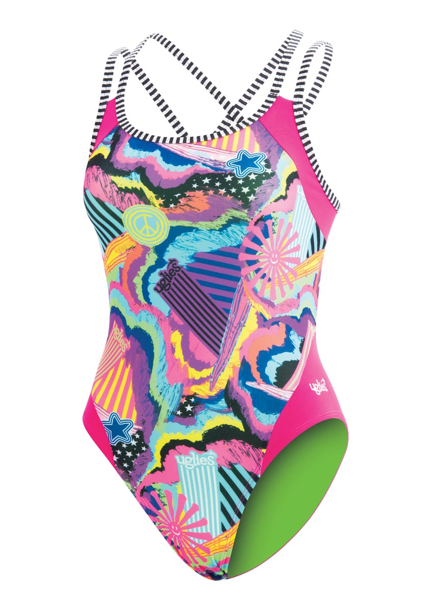 Make a splash with the Dolfin Shooting Star double strap swimsuit, featuring a colourful print on a pink base.