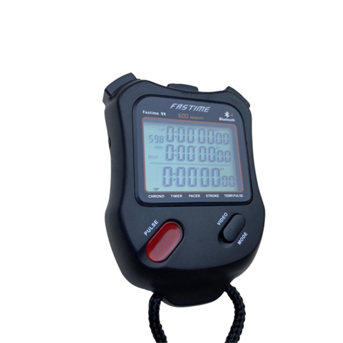 The Fastime 9X is a 600-lap memory, triple display stopwatch with stroke rate function. It is aimed at professional swimming and rowing coaches and timekeepers. The Fastime 9X can now pair with your smartphone via the Merun app allowing coaches to create athlete profiles, data sharing and video and photo capture.