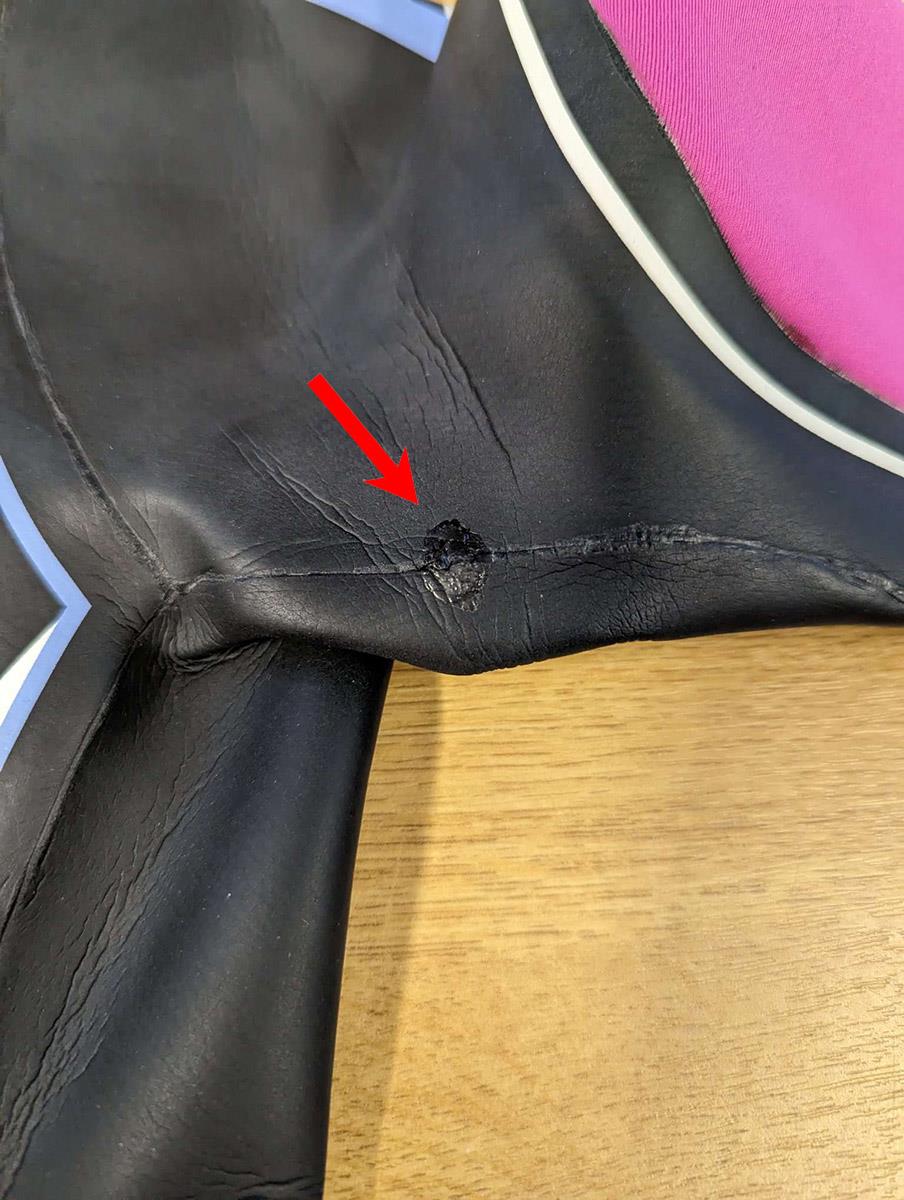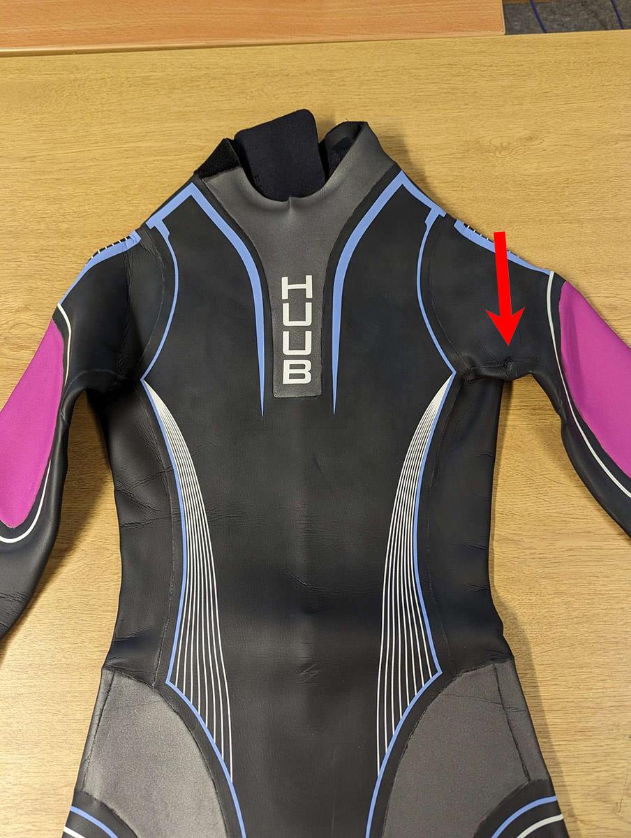 This HUUB wetsuit has been glued to repair a nick, please check images carefully, the arrows highlight repairs.