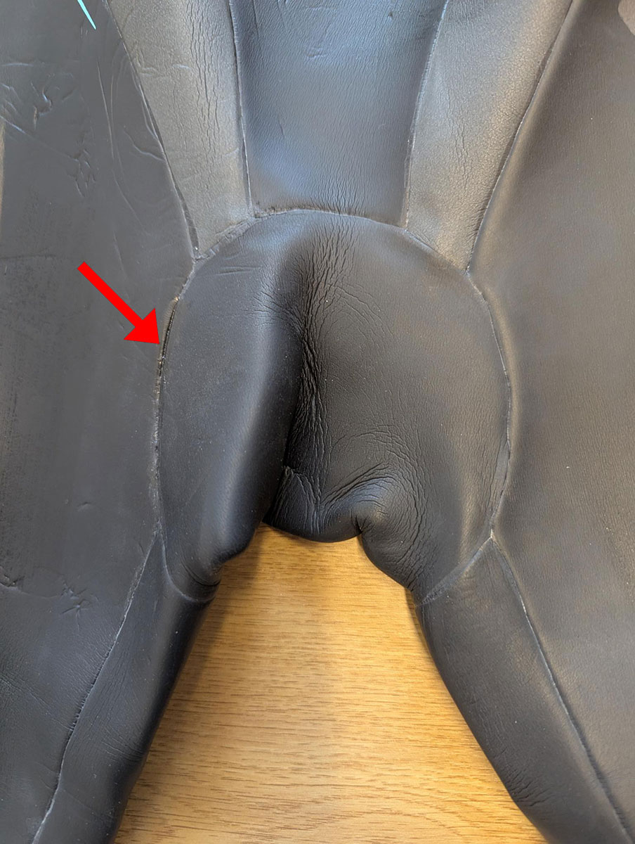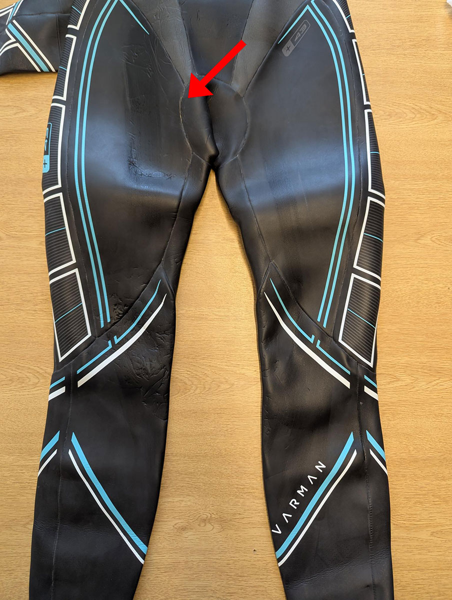 This Huub Wetsuit had split on the seam around the groin it has been glued. In the future, you may need to repair it again with a patch.