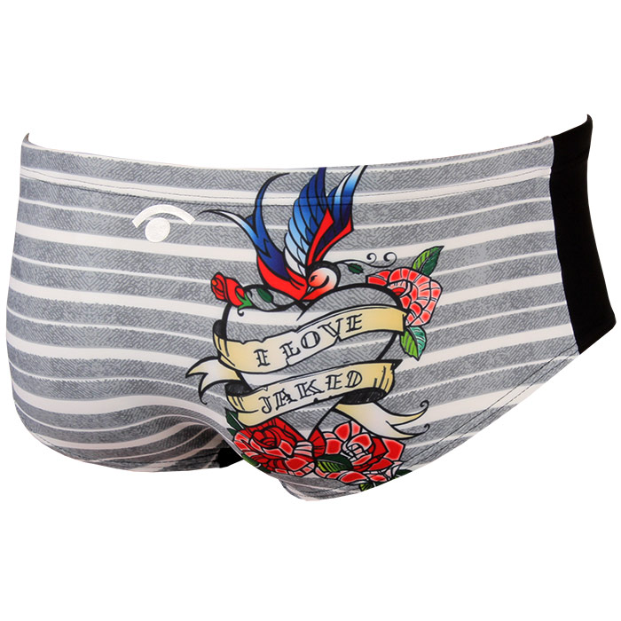 Jaked’s Love Trunks features two contrasting prints, the back of the swim trunks have a colourful stripped print with an ‘I Love Jaked’ golden banner, alongside a beautiful rose & bird whereas the front has a plain blue fabric creating a perfect mix of fun and professionalism in a stylish men’s swimsuit.