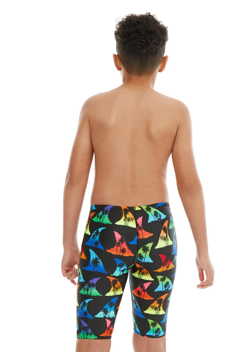 These boys swimming jammers feature a black base, colourful fin design, and palm tree silhouettes for extra contrast.