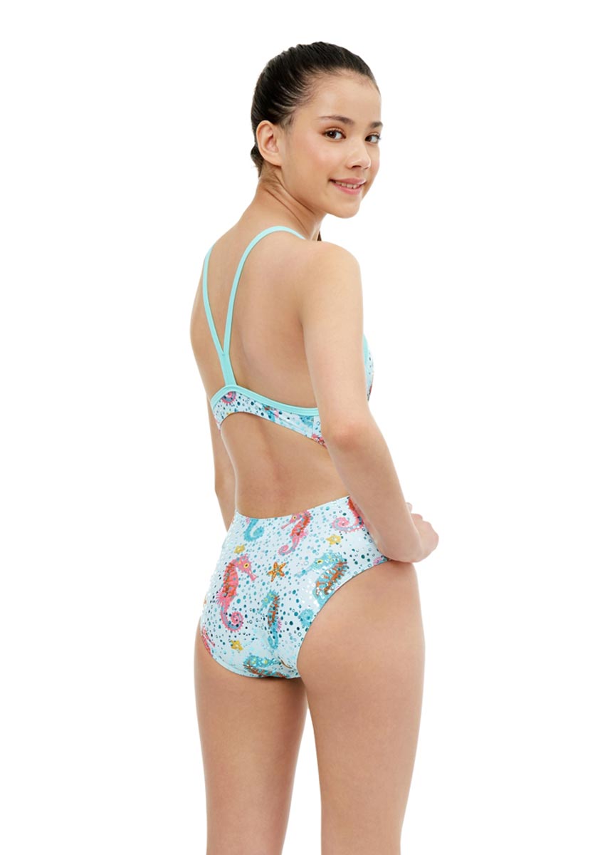 On this aqua blue suit, there are pink and blue seahorses and bright orange starfish. Made of regenerated polyester (78%) and LYCRA® XTRA LIFE™ (22%), this swimsuit will give you the confidence to push yourself even further in the pool. The foiling all over this piece is in a bubbly pattern to give the effect of being underwater. So take a deep breath and prepare to be transported to the deep blue sea with this suit!