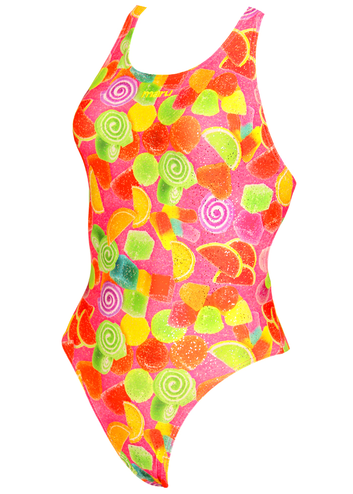 The Maru Girls Pick N Mix Swimsuit from Maru Swimwear features an assortment of sweet treats which will bring happiness to her swim training sessions.