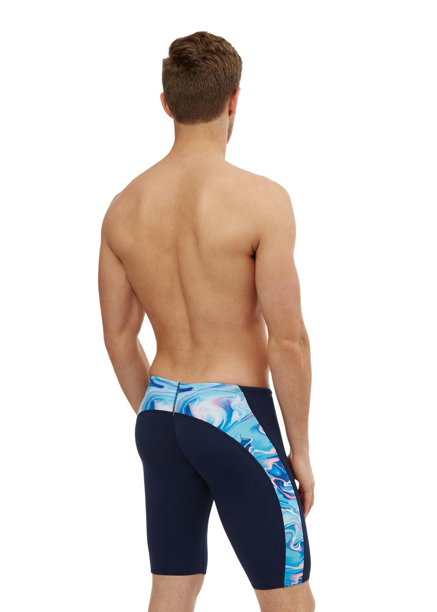 These men’s Maru swimming jammers, have a dark navy base colour, with a marble design on the sides and back band.