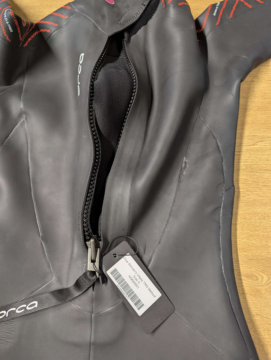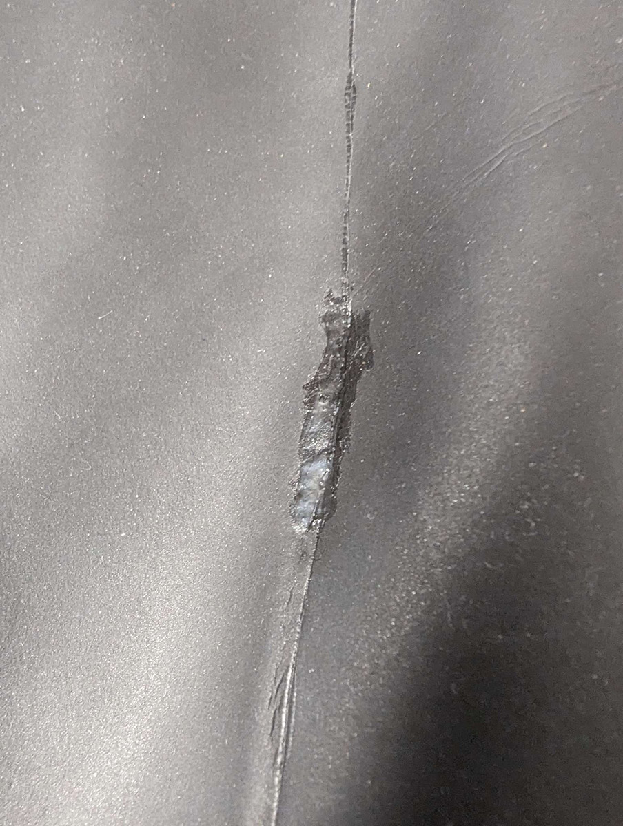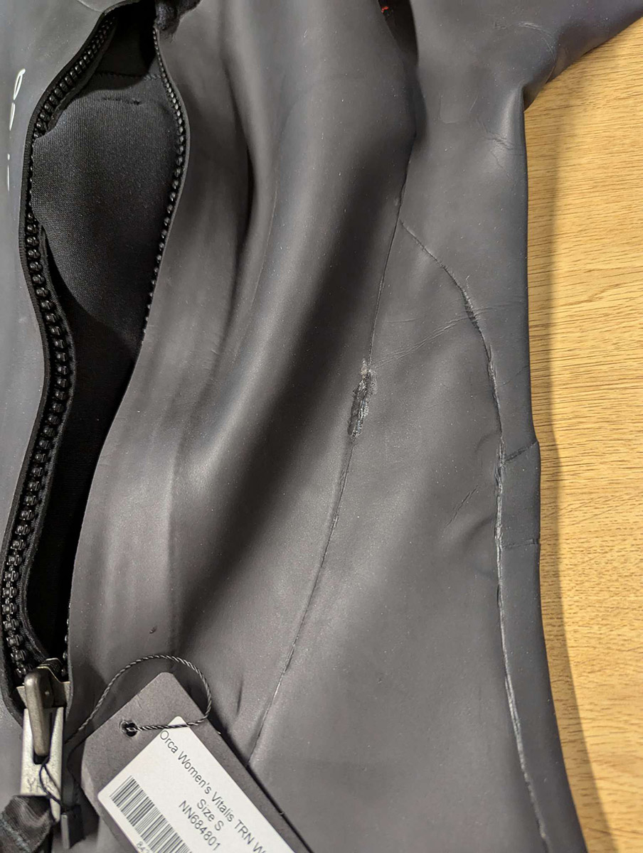 This wetsuit had a hole in the seam it has been glued see the image ( it may need a patch added in the future to ensure the split does not re-occur)