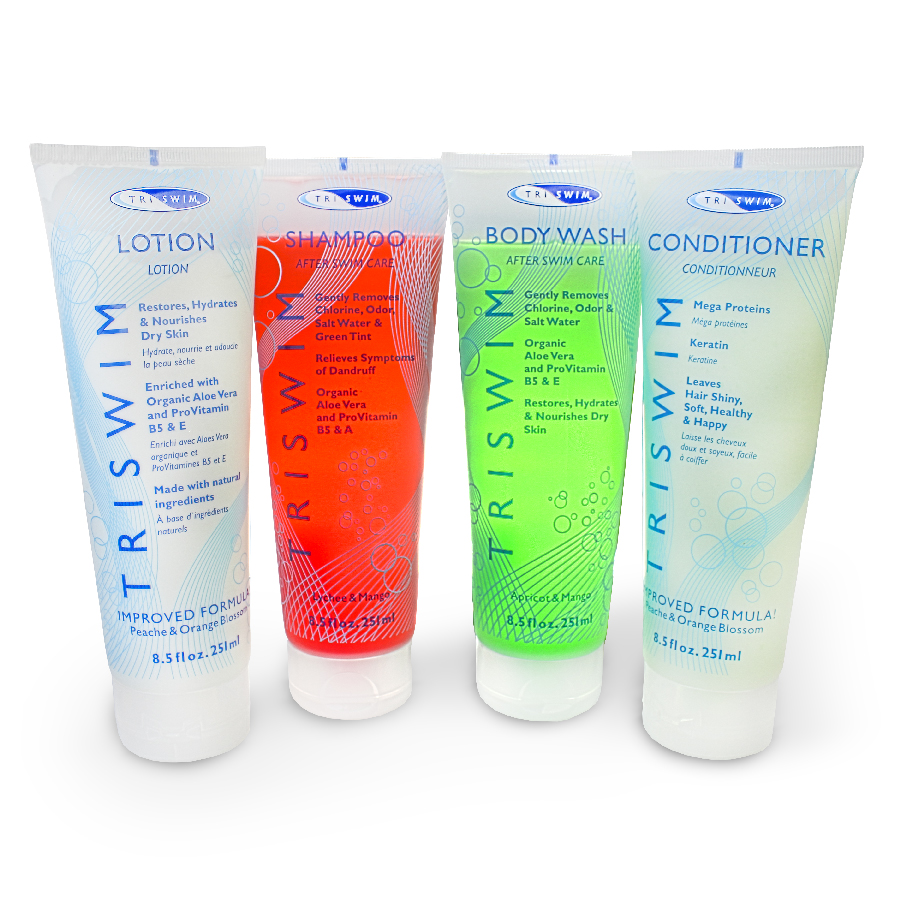 Combat the odour of chlorine while hydrating and moisturising your hair and skin as soon as you exit the pool with this pack containing 8oz tubes of SBR TriSwim Shampoo, Lotion, Conditioner and Body Wash.