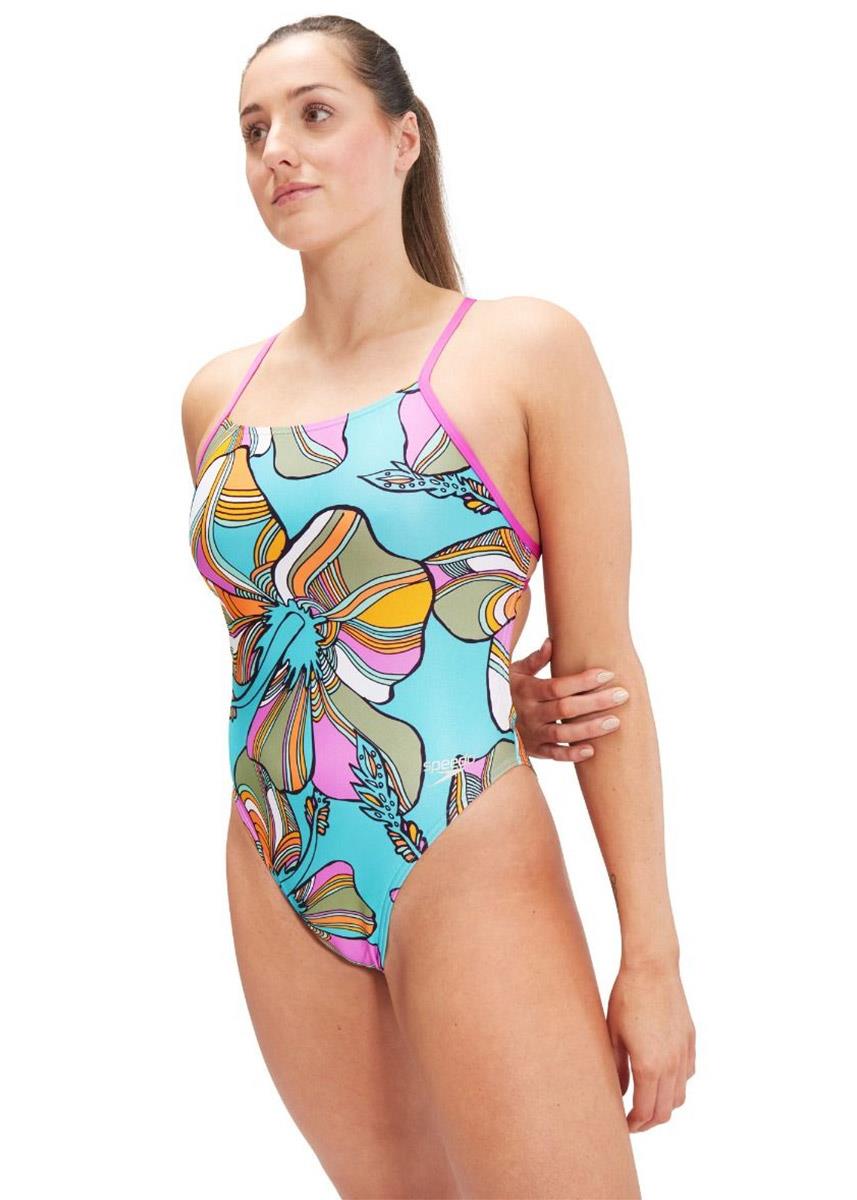 Speedo Womens Allover Digital Tie Back Swimsuit – Fluo Arctic/Neon Violet/Fern Green/Mango