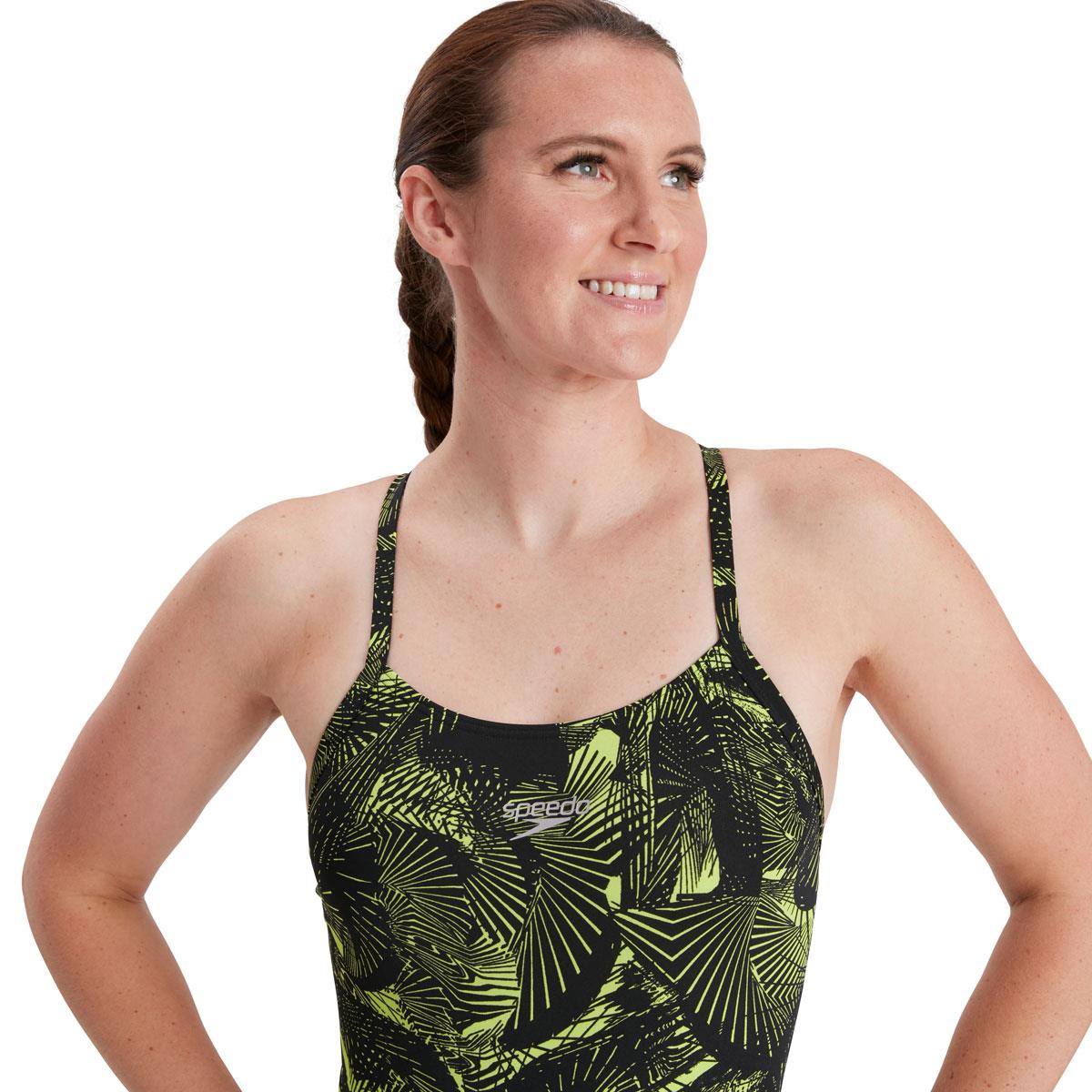 Hit the pool with confidence in the Speedo Women’s Allover Fixed Crossback Swimsuit – Black/ Atomic Lime
