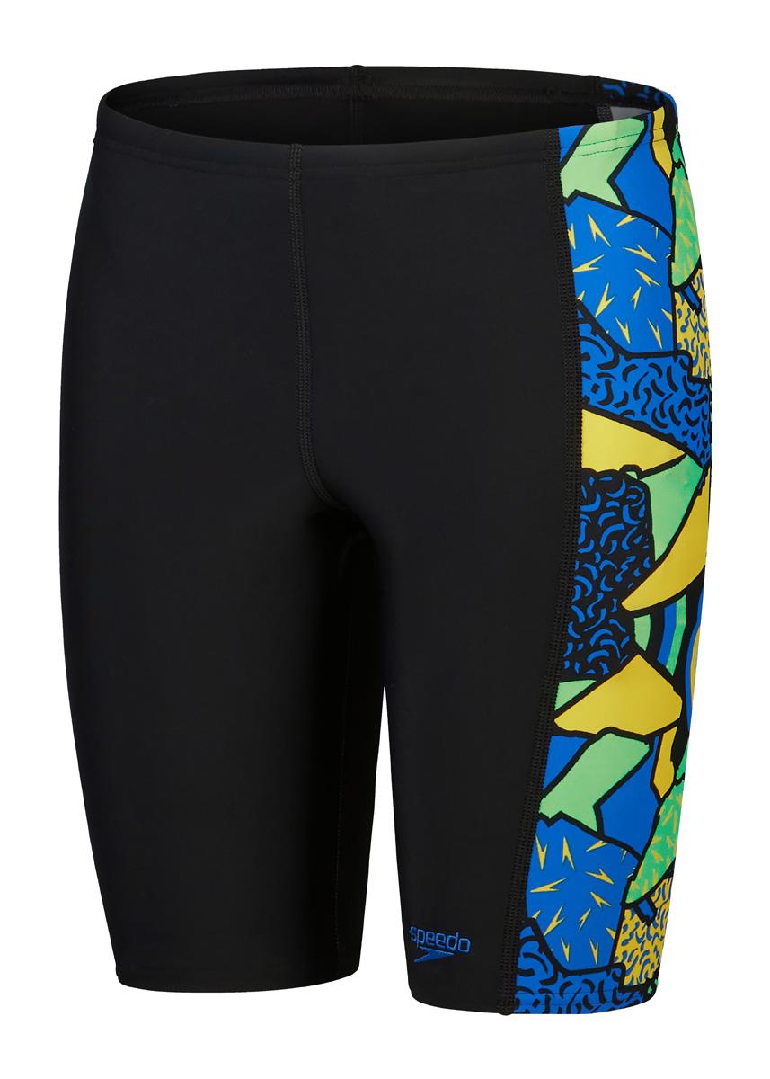 Style and comfort for lessons and training. Ooze confidence wearing this sleek black Jammer, which features side panels of Speedos high-energy abstract print in bright yellow, green and blue. Lined at the front for comfort and modesty, the jammer includes an internal drawcord to allow your child to achieve a secure and comfortable fit. Providing higher chlorine resistance than standard swimwear fabrics, it offers excellent shape retention and fits like new for longer with CREORA® HighClo. If you’re looking for great eco-credentials, it’s got those, too: Speedo exclusive Eco EnduraFlex fabric is made from 100% recycled pre-consumer waste, such as fabric waste from factories.