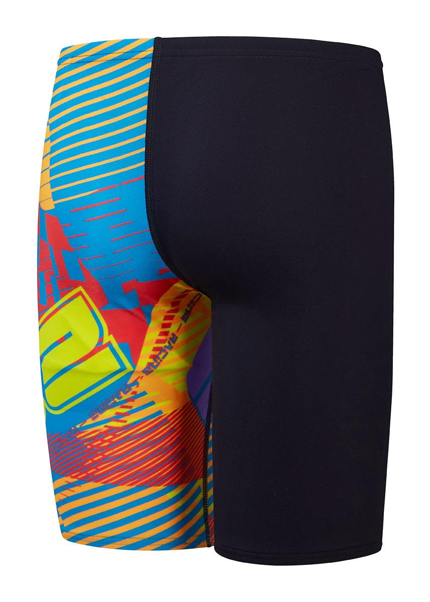 Step training up a gear wearing the Speedo boys Allover Digital Rally Car Rumble Jammer, featuring a retro-style print inspired by racing car livery.