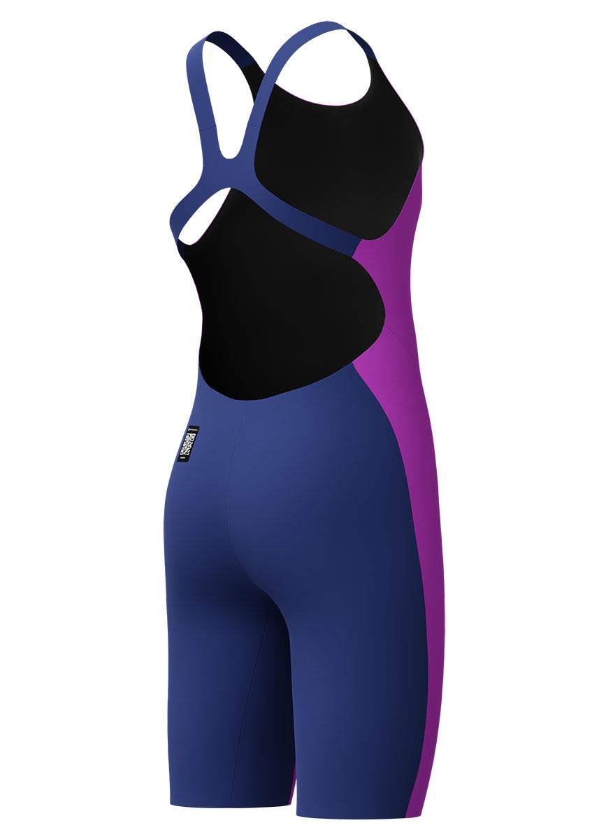 Rendered in a striking purple and navy palette, its openback design provides increased freedom of movement, while the kneeskin cut affords additional coverage and support. With its modern aesthetic, this swimsuit ensures your youngster stands out in style.