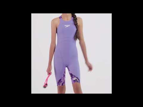 Feel race-ready wearing the new Fastskin Junior LZR Ignite Openback Kneeskin, in Miami lilac with a high energy blocked print.