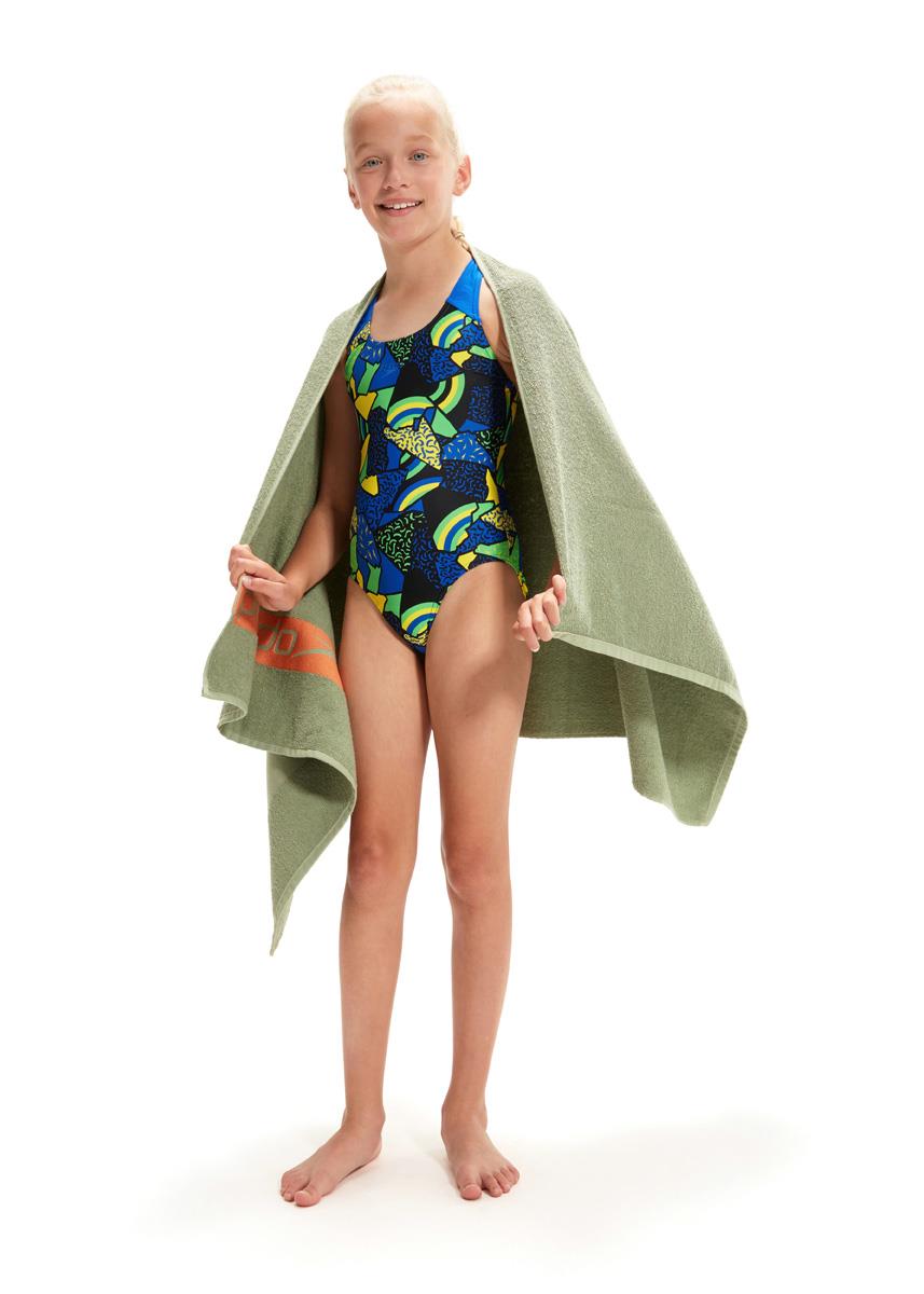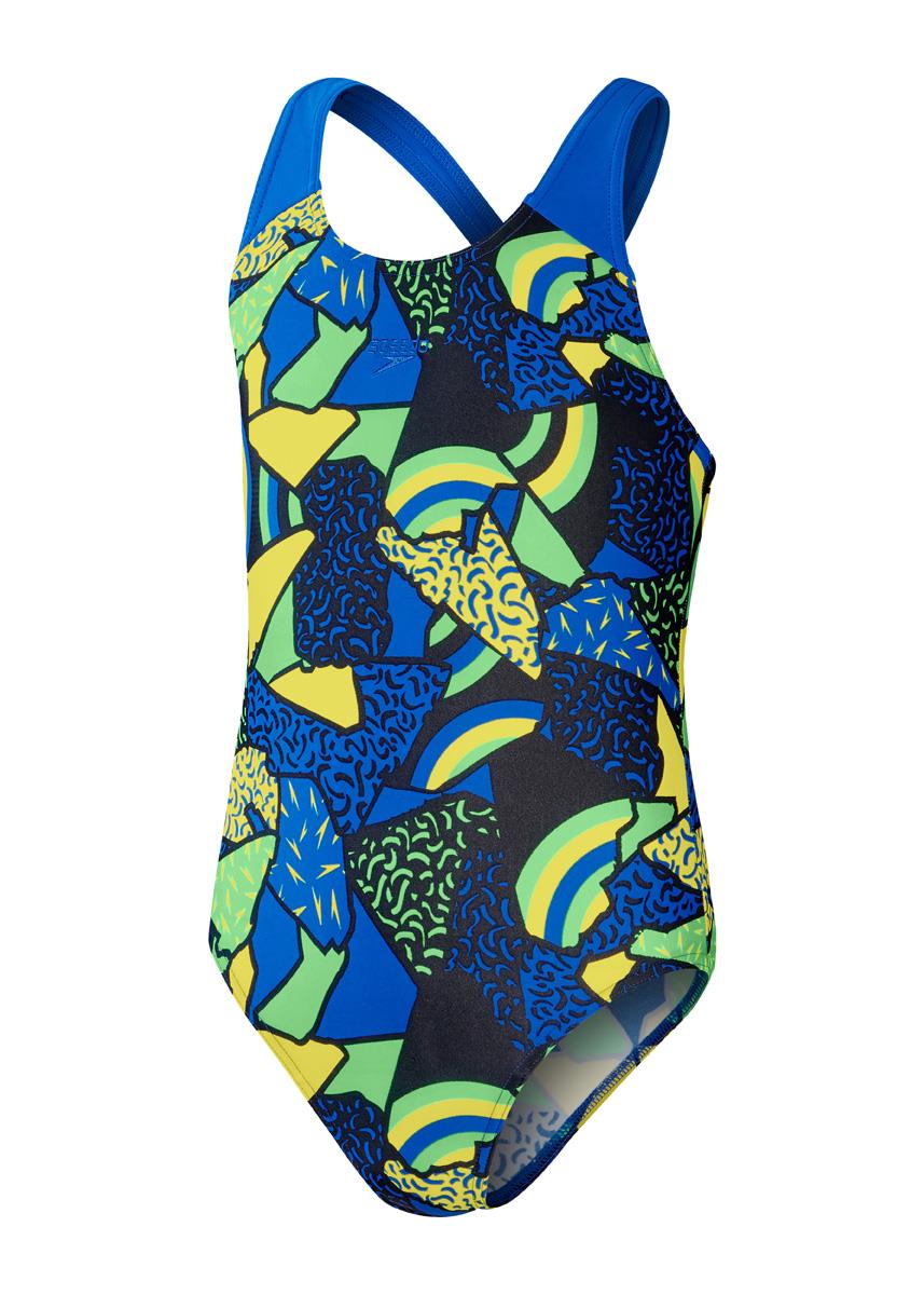 Ooze confidence and positivity in this fun Splashback swimsuit featuring a high-energy abstract print in bright yellow, green and blue. Ideal for training and lessons, the splashback design includes straps set away from the shoulders to increase freedom of movement, allowing young swimmers to train without feeling restricted. Providing higher chlorine resistance than standard swimwear fabrics, the swimsuit offers excellent shape retention and fits like new for longer with CREORA® HighClo. If you’re looking for great eco-credentials, it’s got those, too: Speedo exclusive Eco EnduraFlex fabric is made from 100% recycled pre-consumer waste, such as recycled fabric waste from factories.