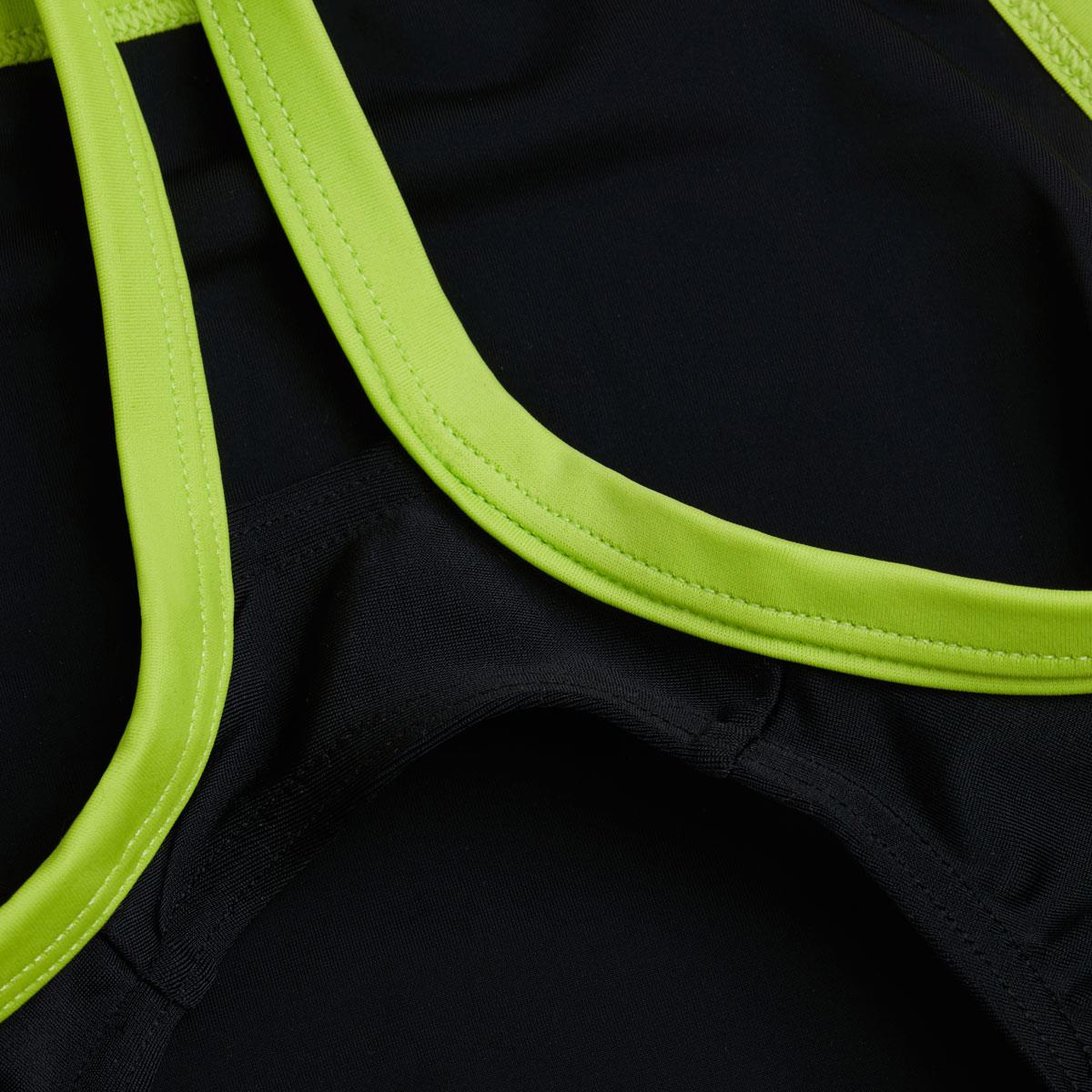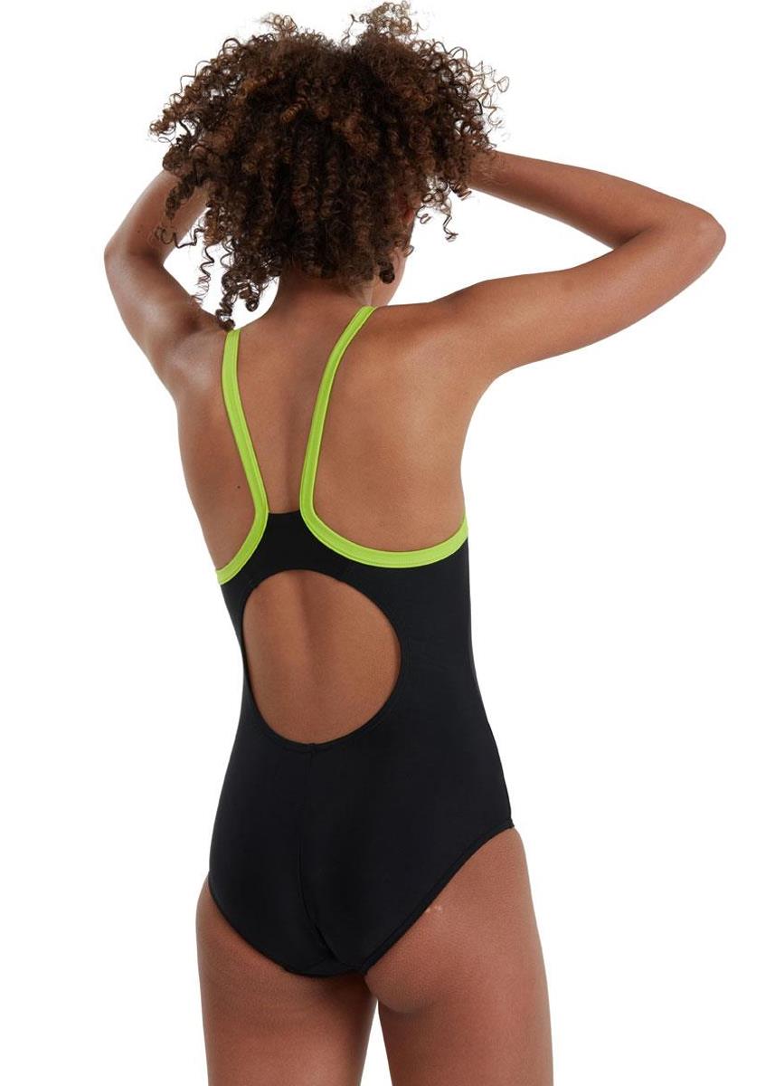training. Sleek in black with contrasting lime straps and a pink Speedo logo, the muscleback style includes thin, supportive straps for total flexibility during their swim. Quick-drying and stretchy to keep active kids comfortable, it’s made from Endurance10 fabric which is designed to keep its shape.