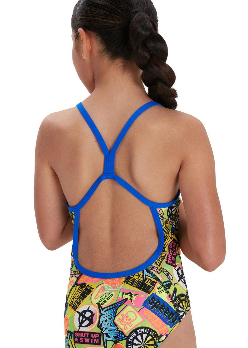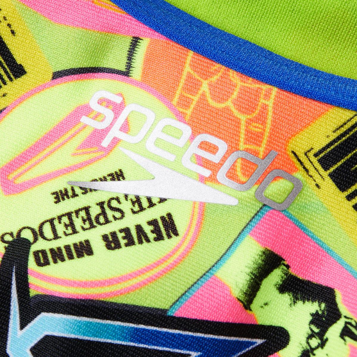 Rule the pool in graphic, eye-catching prints. A go-to for junior training, this Vback swimsuit features a zany digital montage of danger signs, badge-style graphics and Speedo logos. Offering a modest cut for junior swimmers, the simple Vback is comfortable to train in and provides maximum freedom of movement. Fully front lined in atomic lime for comfort and modesty.